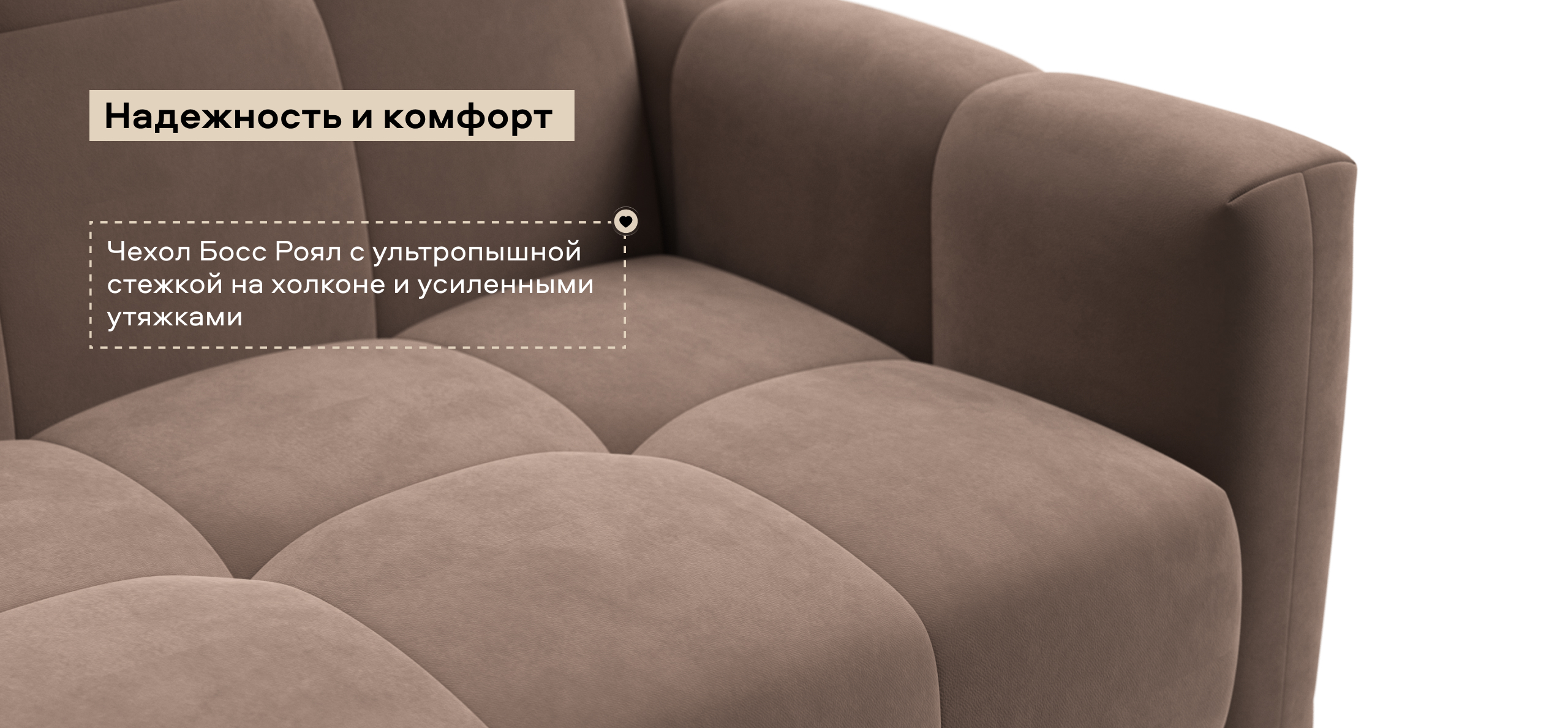 Чехол Босс Роял с ультропышной стежкой на холконе и усиленными утяжками делает диван пышным и воздушным, а усиленные утяжки надежно фиксируют чехол и защищают его от растяжения.