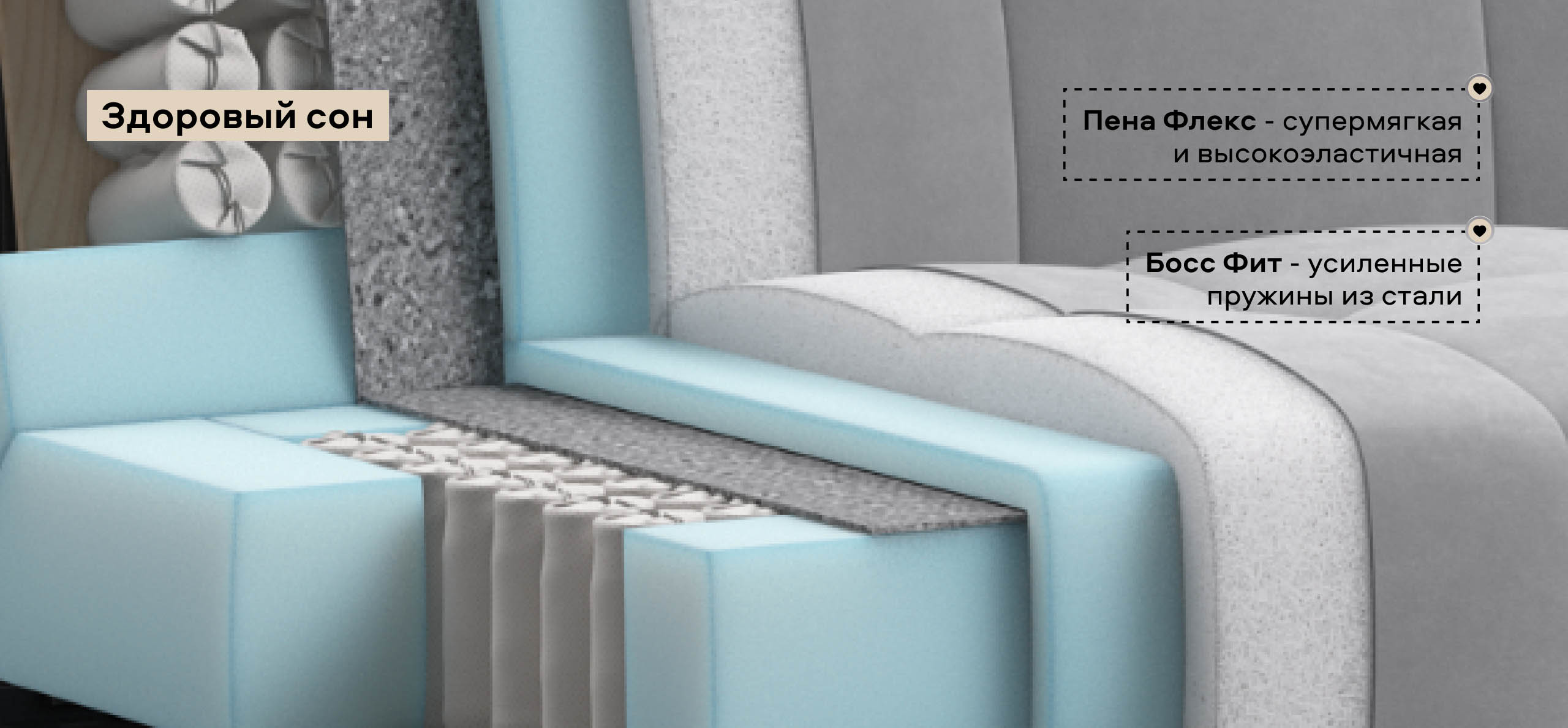 Инновационный анатомический матрас в диване, высотой 15 см., выполнен из полноценного независимого пружинного блока Босс Фит и высокоэластичной пены Флекс – гарантия здорового сна, как на кровати!