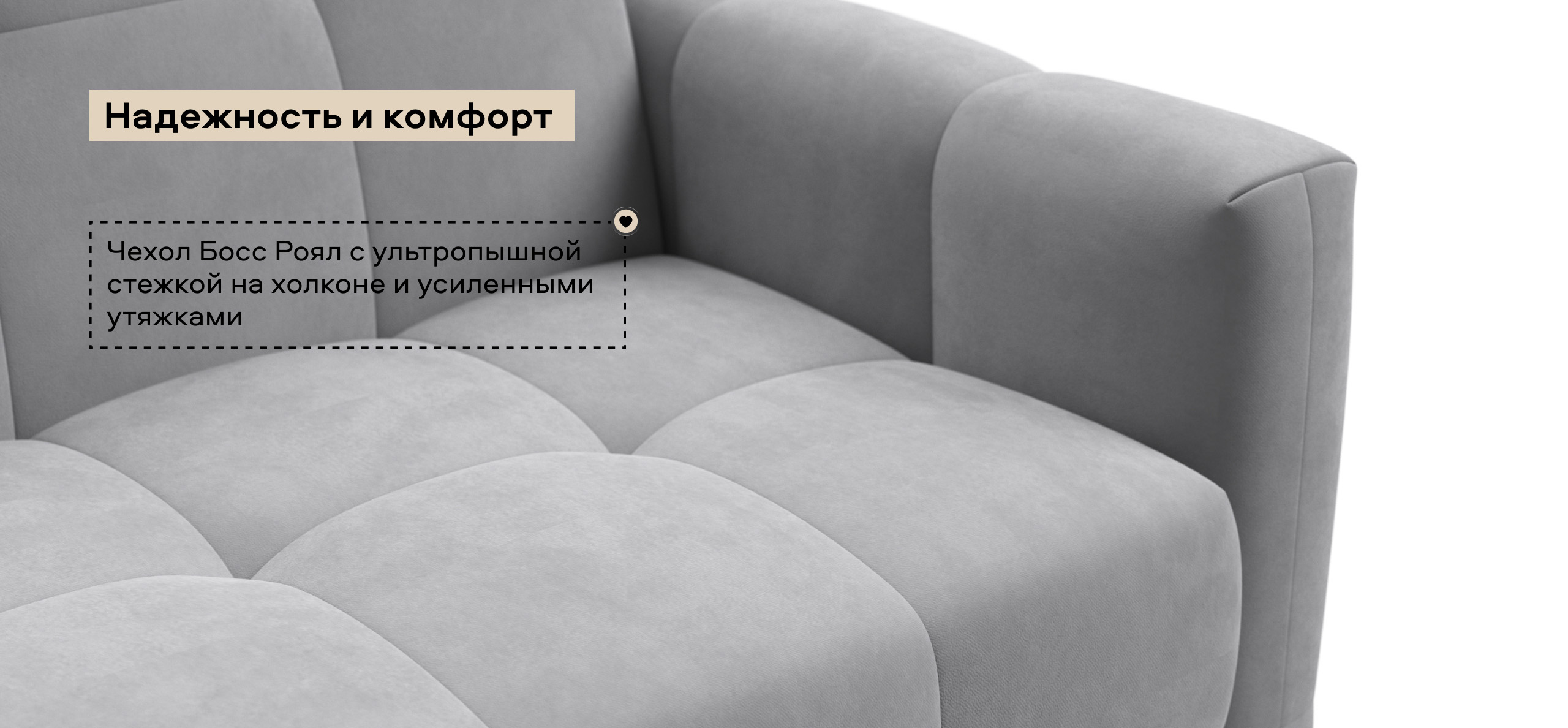 Чехол Босс Роял с ультропышной стежкой на холконе и усиленными утяжками делает диван пышным и воздушным, а усиленные утяжки надежно фиксируют чехол и защищают его от растяжения.