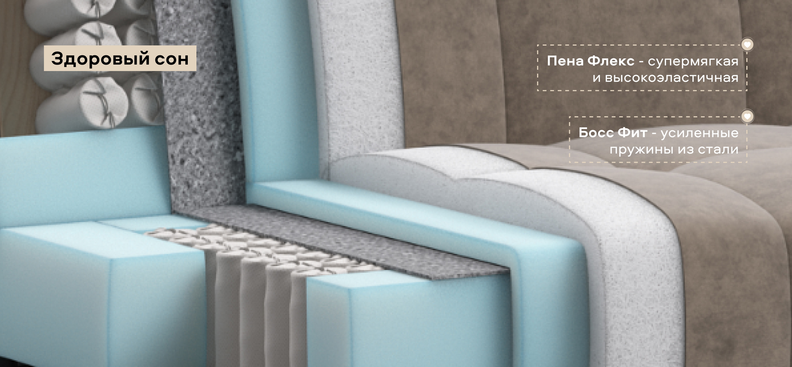 Инновационный анатомический матрас в диване, высотой 15 см., выполнен из полноценного независимого пружинного блока Босс Фит и высокоэластичной пены Флекс – гарантия здорового сна, как на кровати!