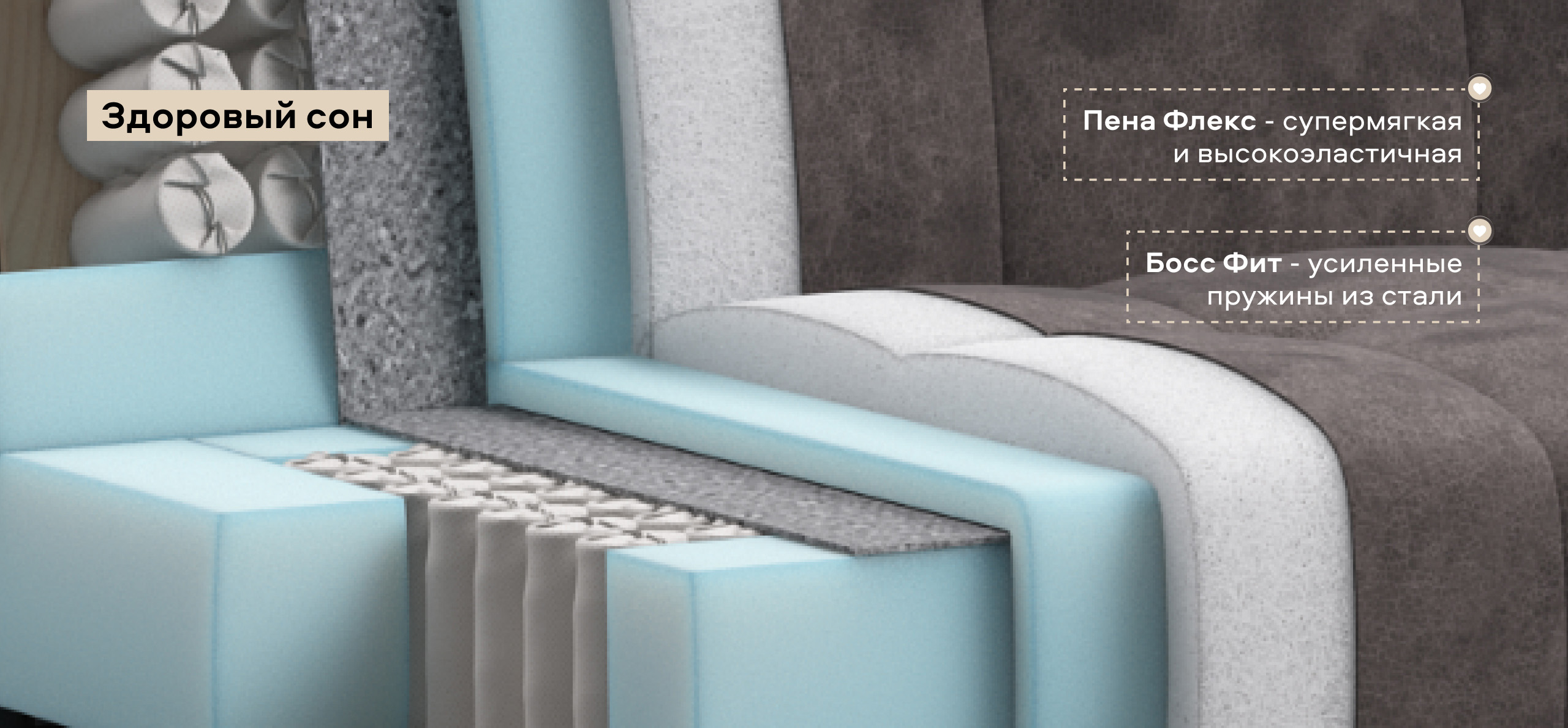 Инновационный анатомический матрас в диване, высотой 15 см., выполнен из полноценного независимого пружинного блока Босс Фит и высокоэластичной пены Флекс – гарантия здорового сна, как на кровати!