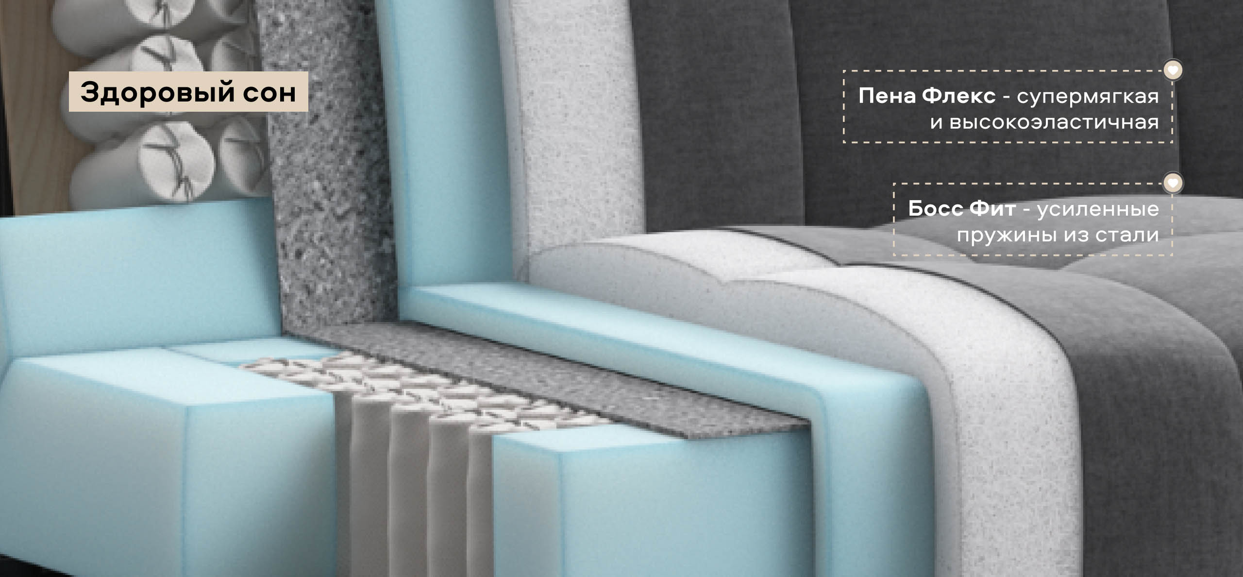 Инновационный анатомический матрас в диване, высотой 15 см., выполнен из полноценного независимого пружинного блока Босс Фит и высокоэластичной пены Флекс – гарантия здорового сна, как на кровати!