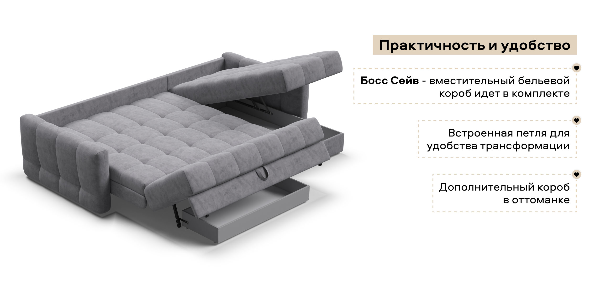 В комплекте с диваном идет бельевой короб Босс Сейв и не нужно за него доплачивать, а также дополнительный короб в оттоманке!