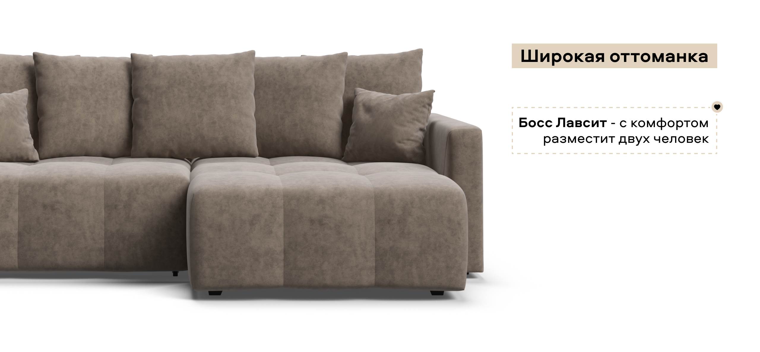 Широкая оттоманка Босс Лавсит - с комфортом разместит двух человек. Независимый пружинный блок в основании и механизм еврокнижка превращают диван в комфортное спальное место с анатомическим эффектом.