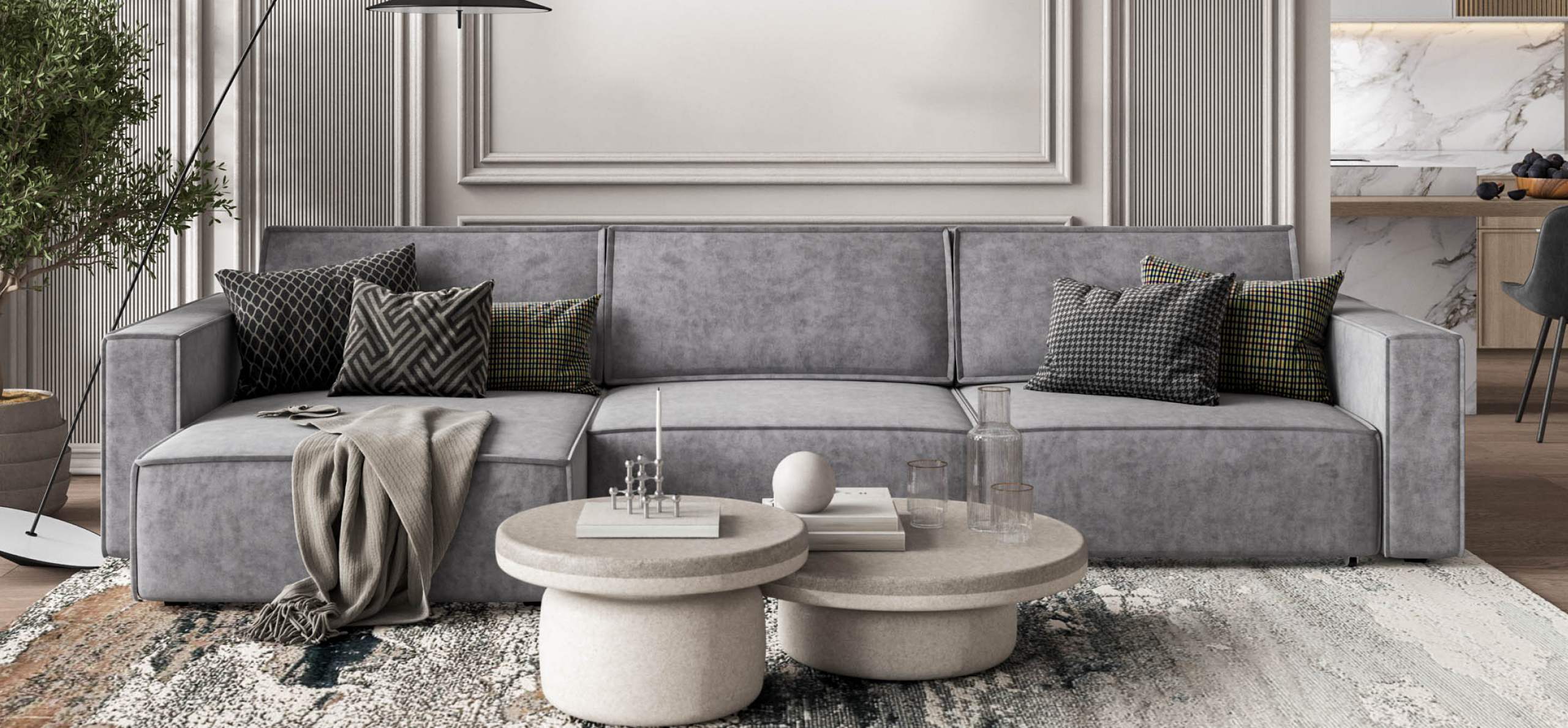 Широкие прямоугольные подлокотники, строгая симметрия и минималистичная отделка идеально дополнит современный интерьер Вашей гостиной.