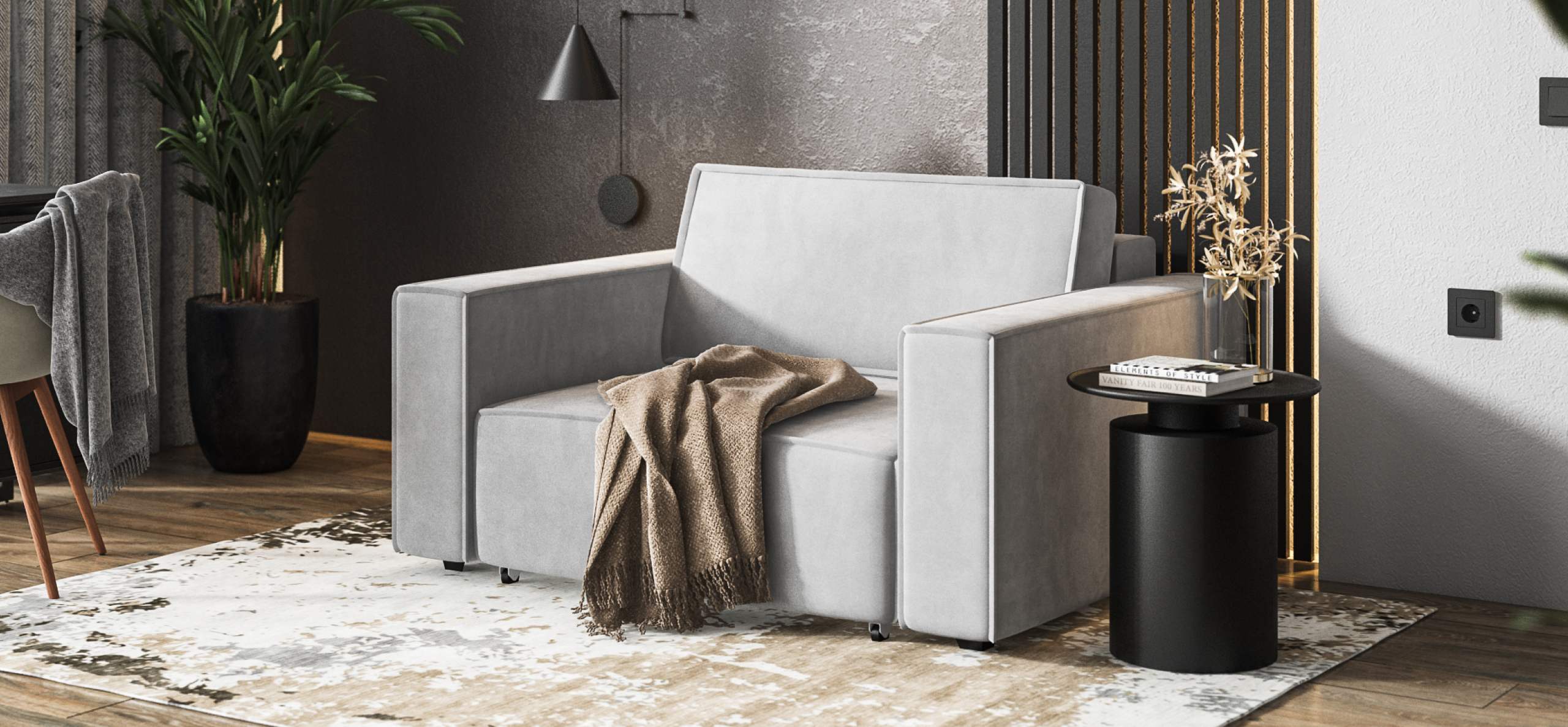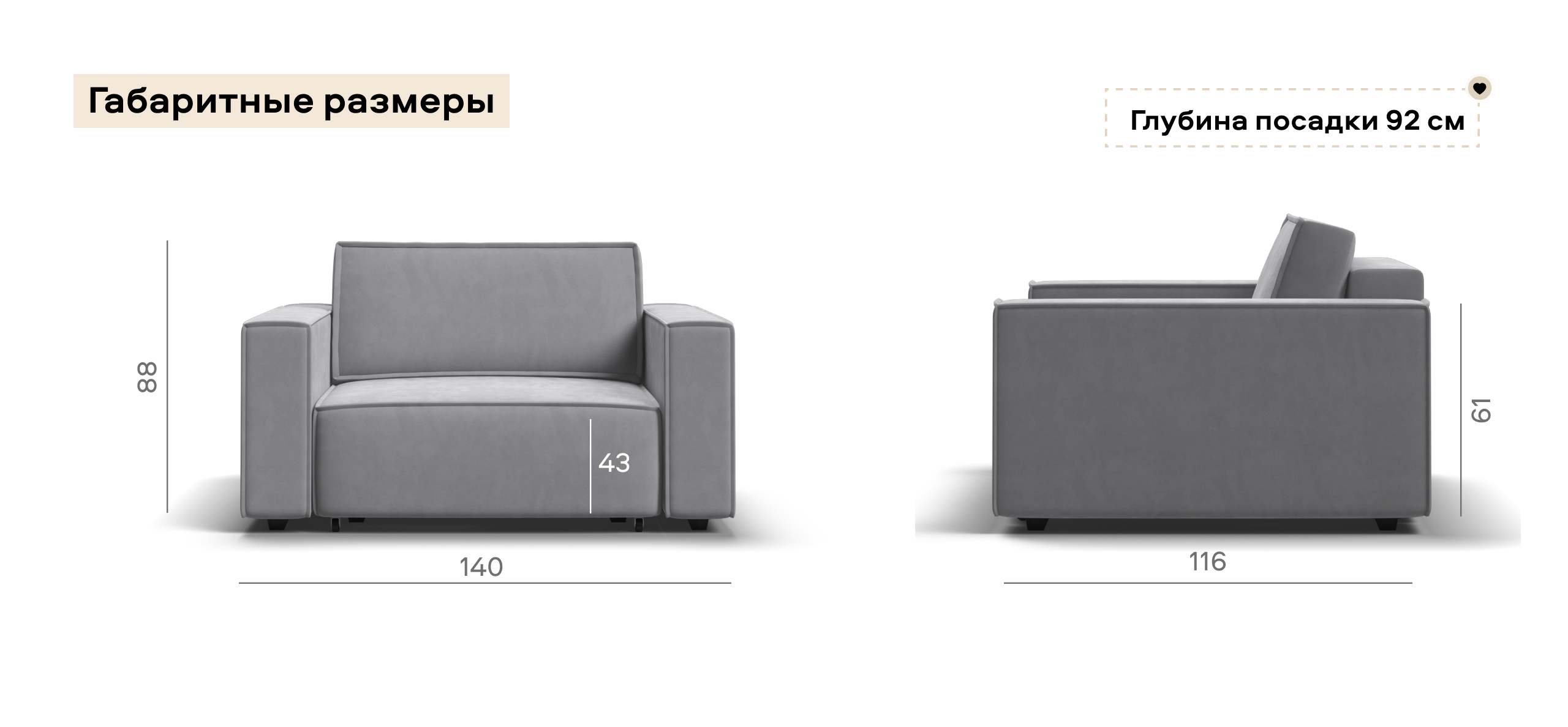 Широкие прямоугольные подлокотники, строгая симметрия и минималистичная отделка идеально дополнит современный интерьер Вашей гостиной.