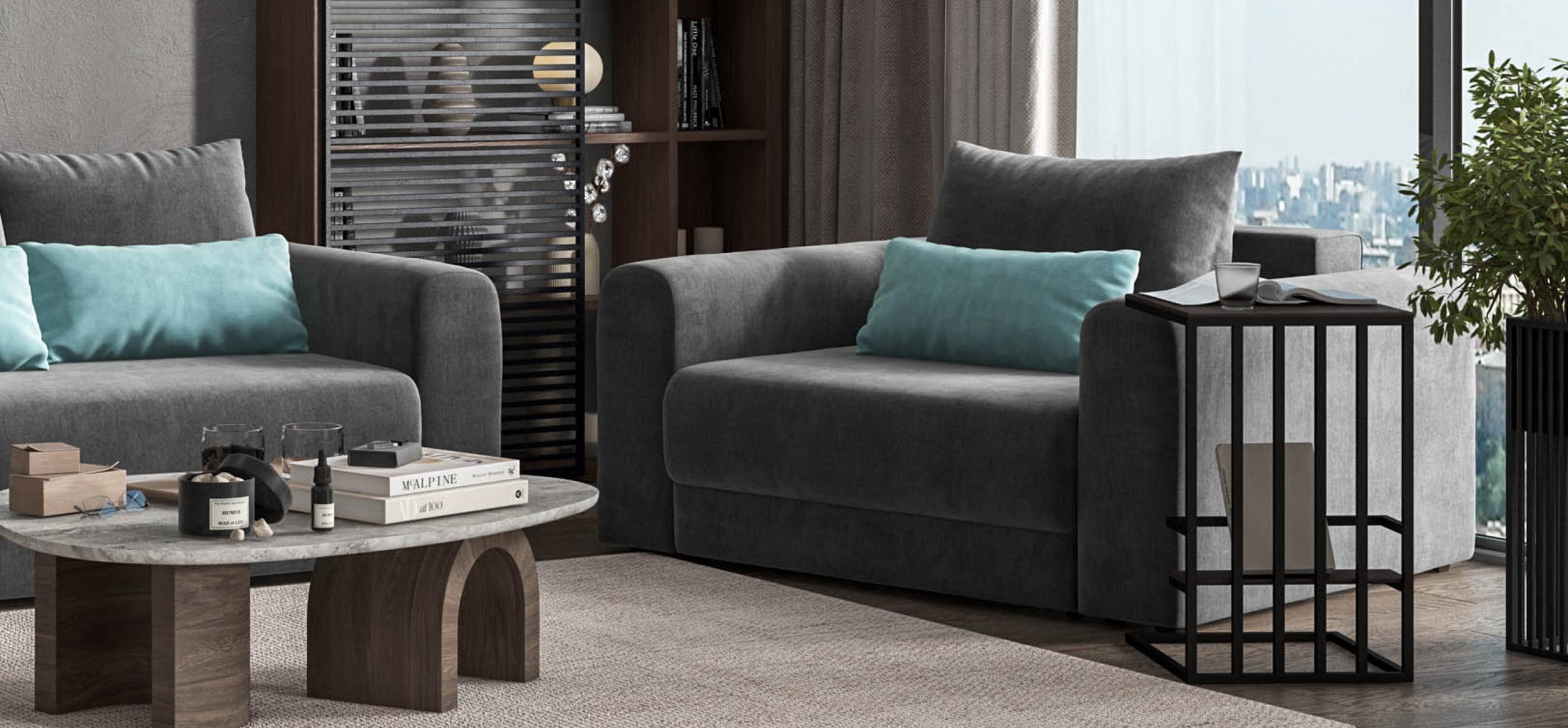 Широкие скругленные подлокотники, плавные линии и приспинные подушки разного размера - стильный комфорт в каждой детали.