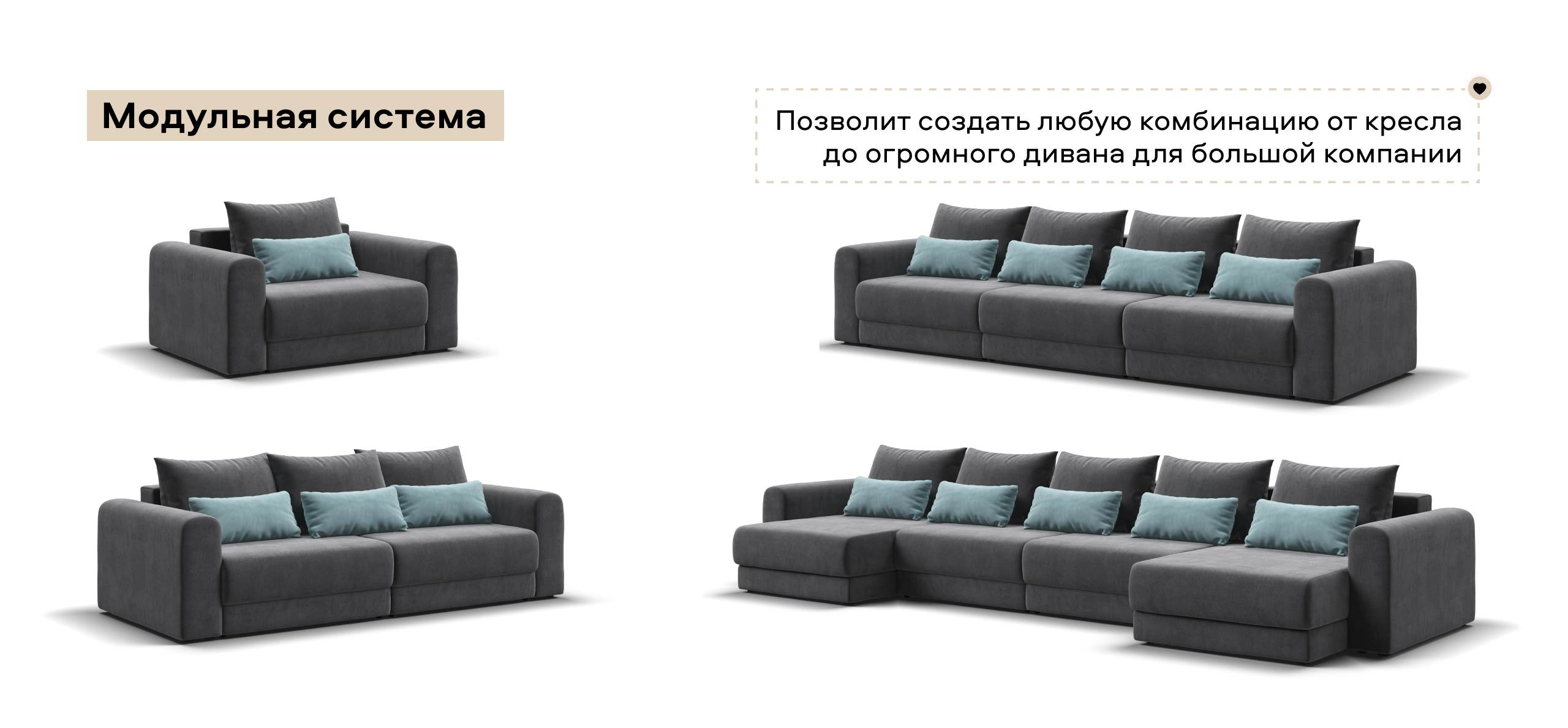 Модульная система позволит создать любую комбинацию от уютного кресла до огромного дивана для большой компании.