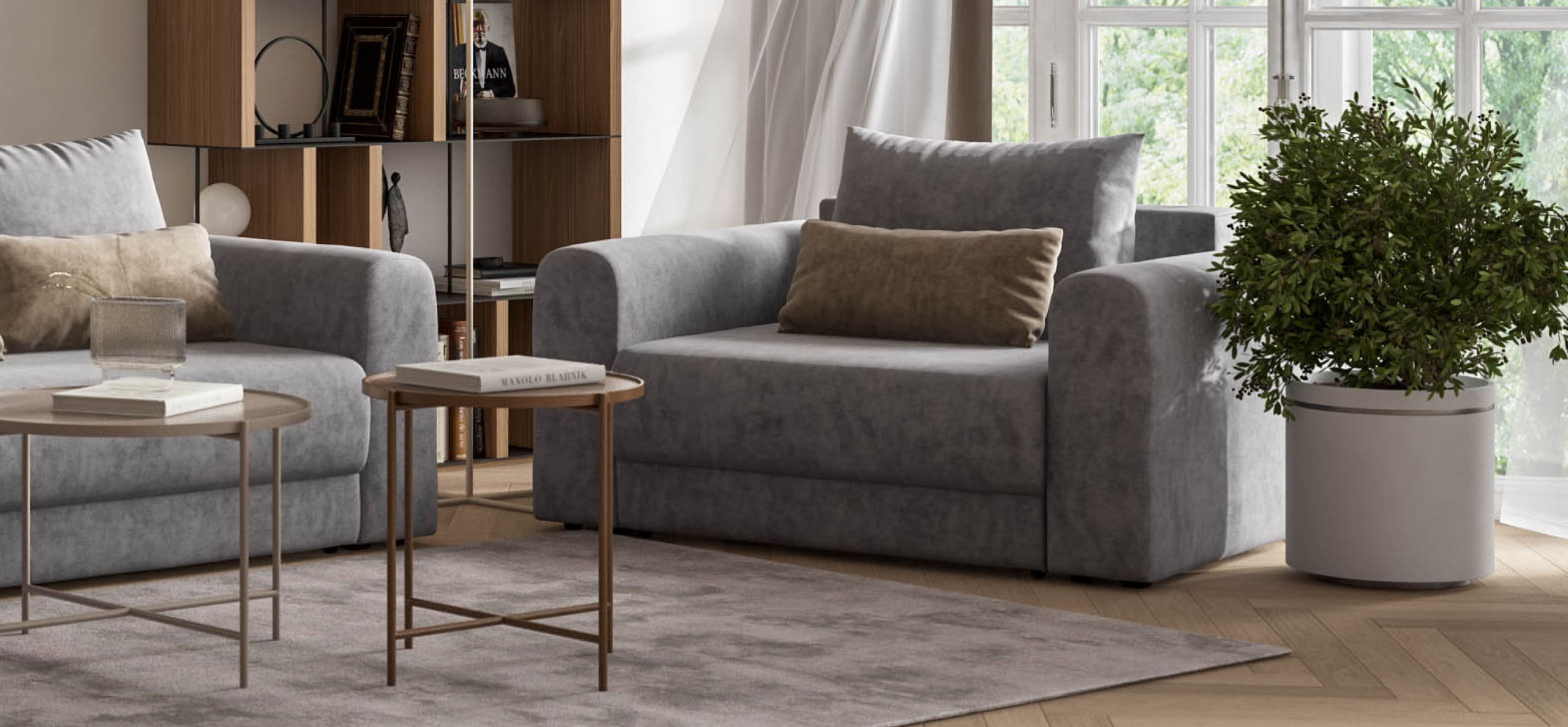 Широкие скругленные подлокотники, плавные линии и приспинные подушки разного размера - стильный комфорт в каждой детали.