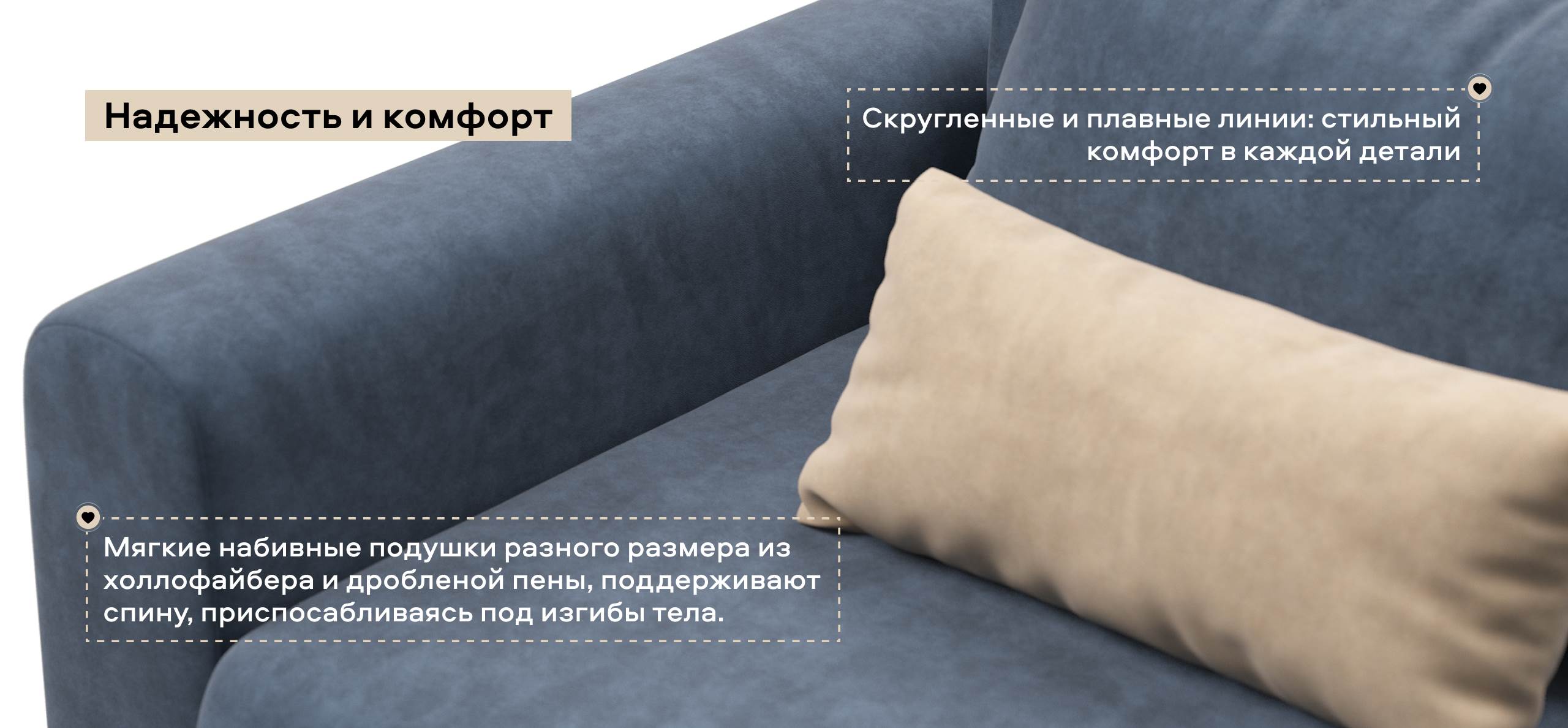 Широкие скругленные подлокотники, плавные линии и приспинные подушки разного размера - стильный комфорт в каждой детали.