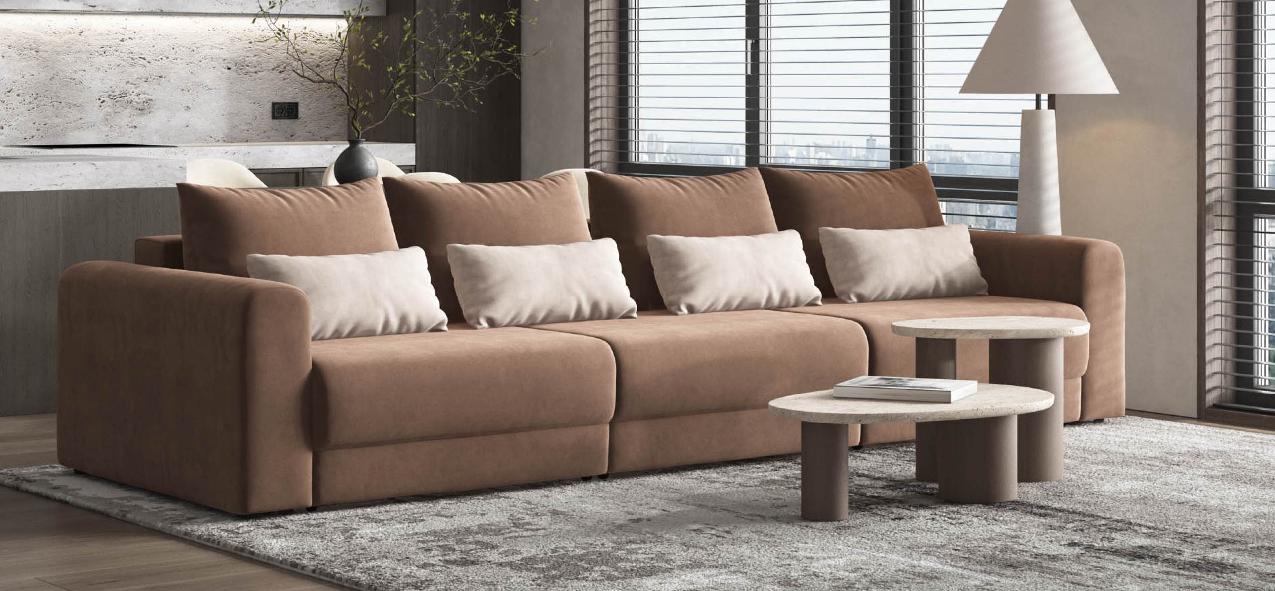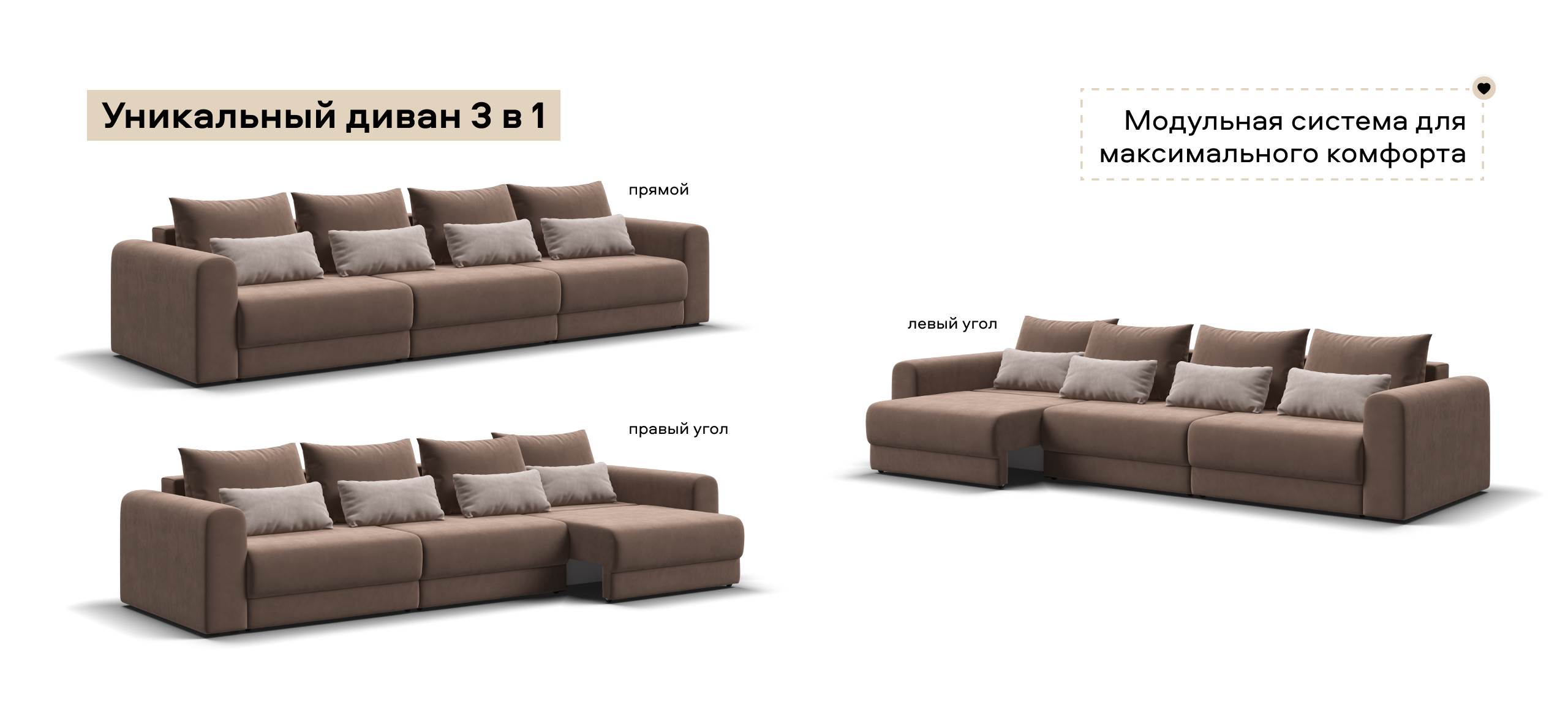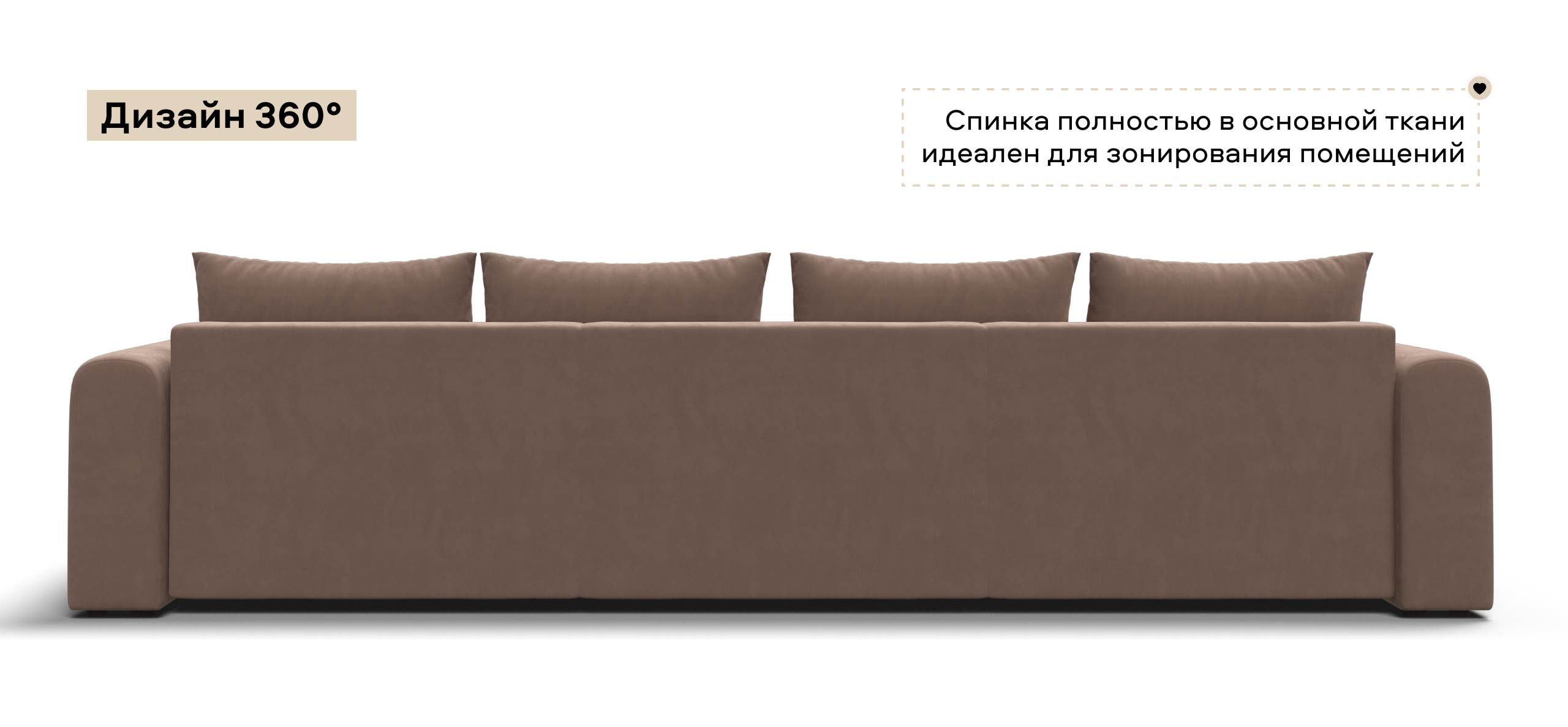 Широкие скругленные подлокотники, плавные линии и приспинные подушки разного размера - стильный комфорт в каждой детали.