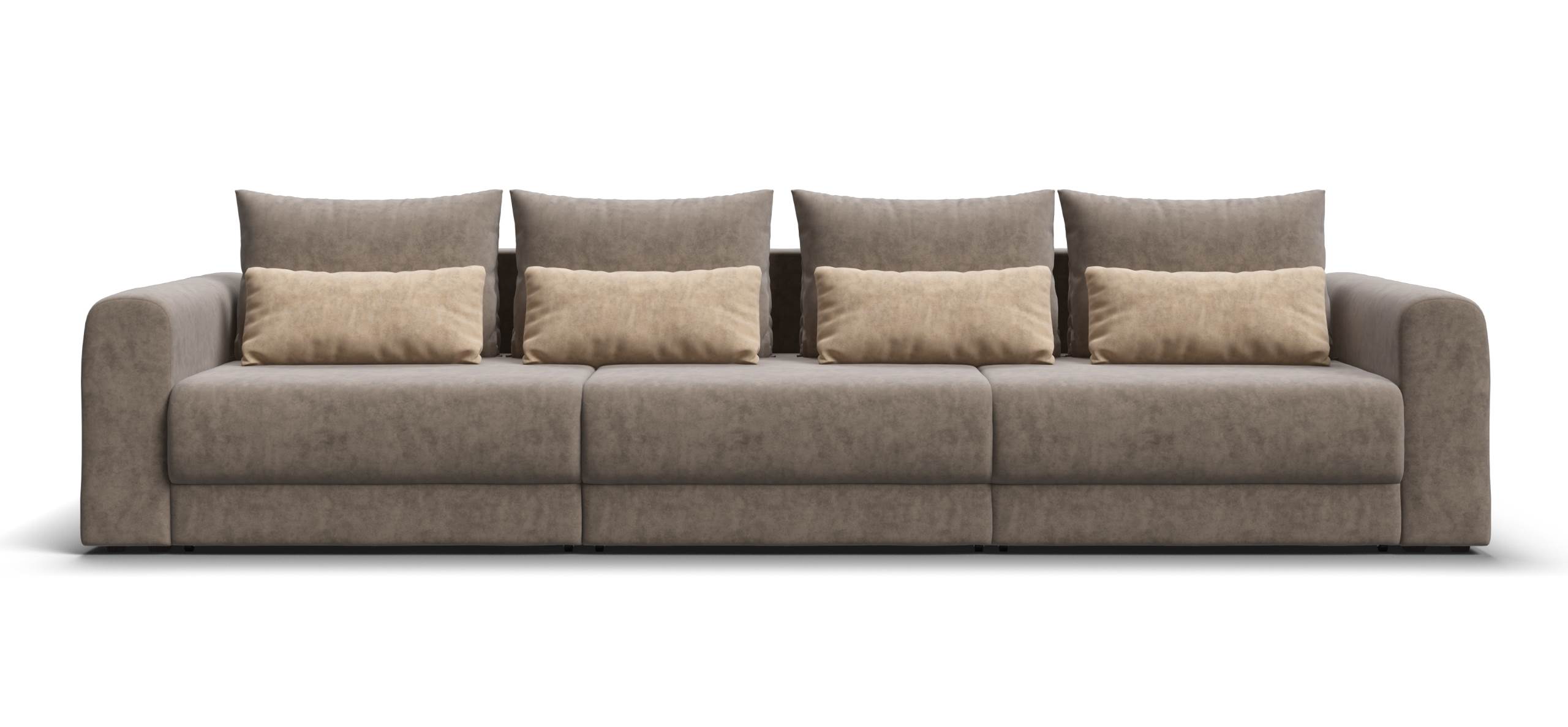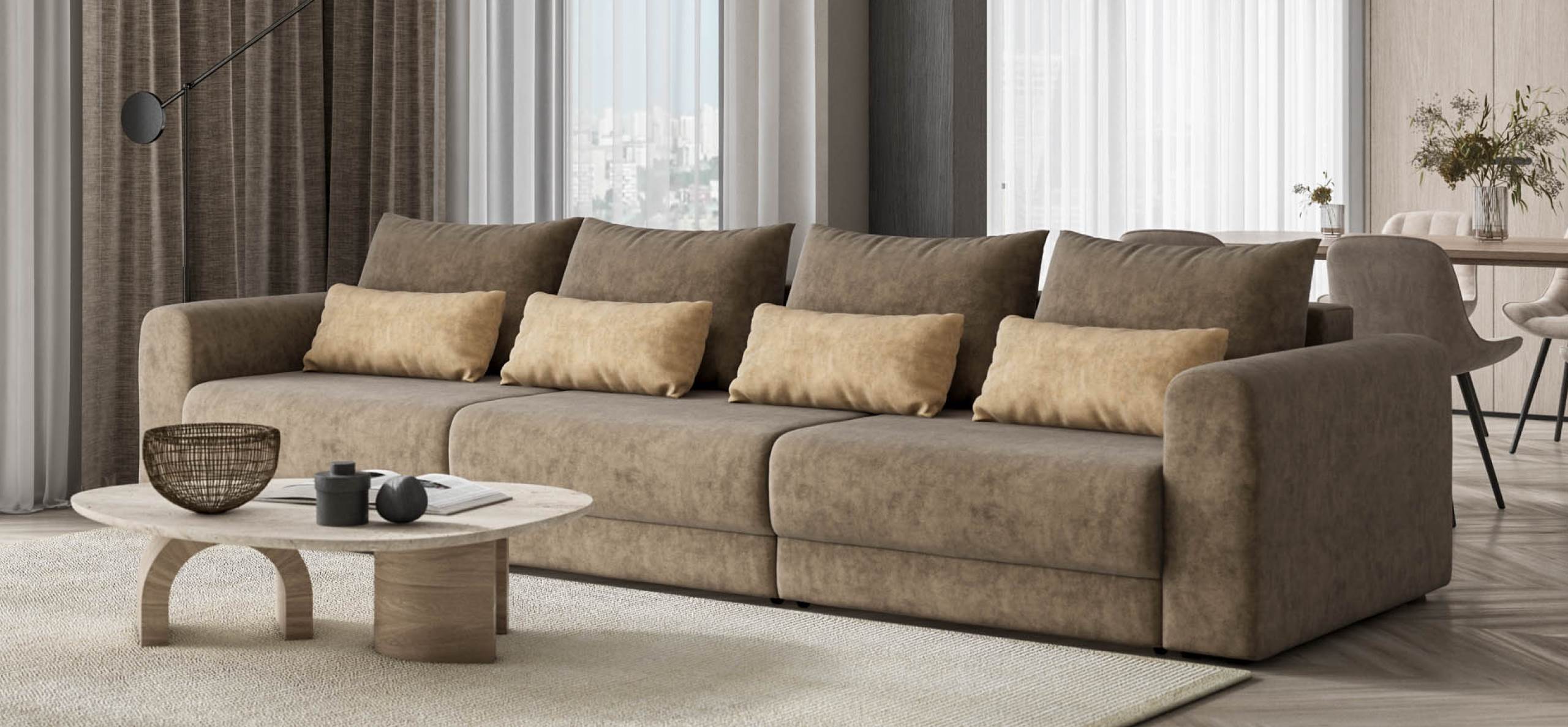 Широкие скругленные подлокотники, плавные линии и приспинные подушки разного размера - стильный комфорт в каждой детали.