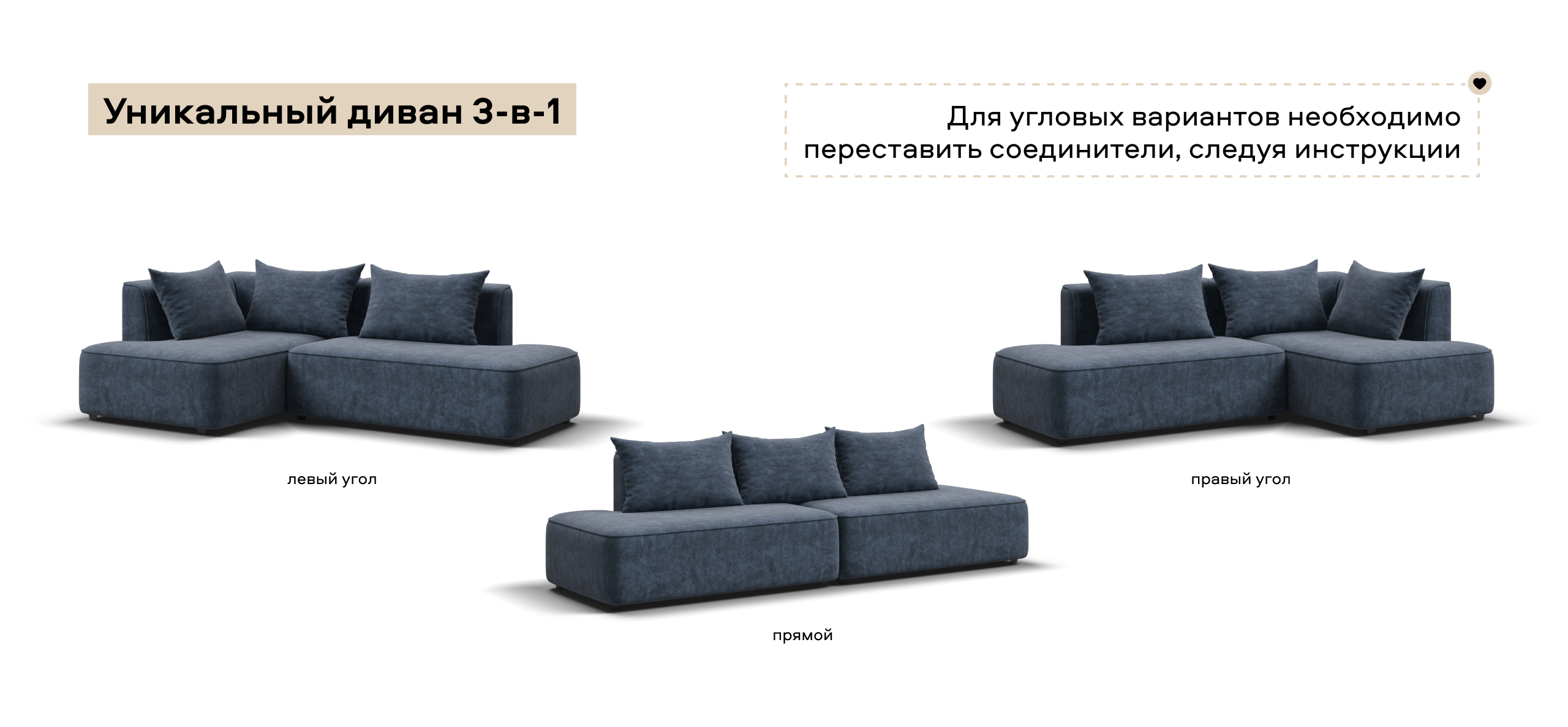 Универсальный дизайн 3-в-1 позволяет быстро менять его форму — левый угол, правый угол и прямой — всё для Вашего комфорта.