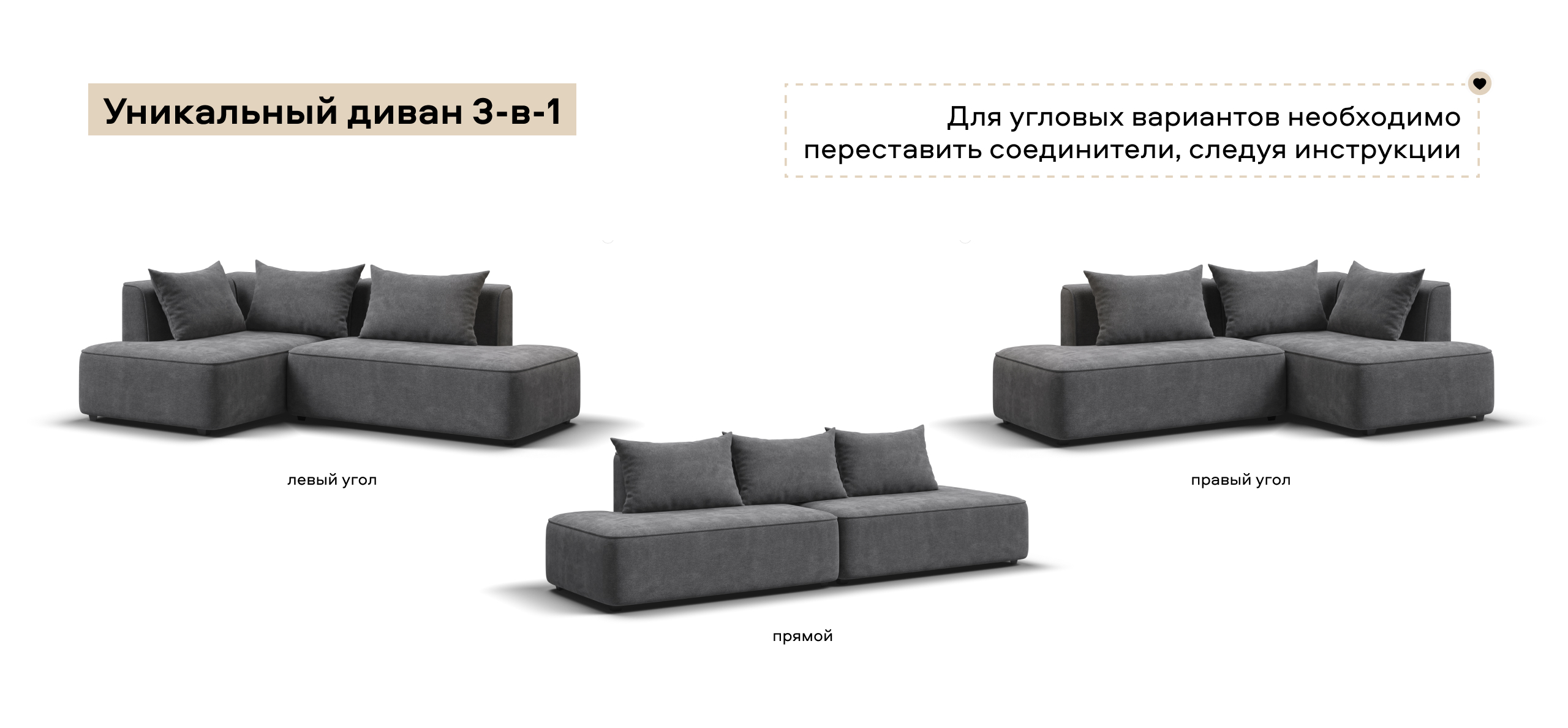 Универсальный дизайн 3-в-1 позволяет быстро менять его форму — левый угол, правый угол и прямой — всё для Вашего комфорта.