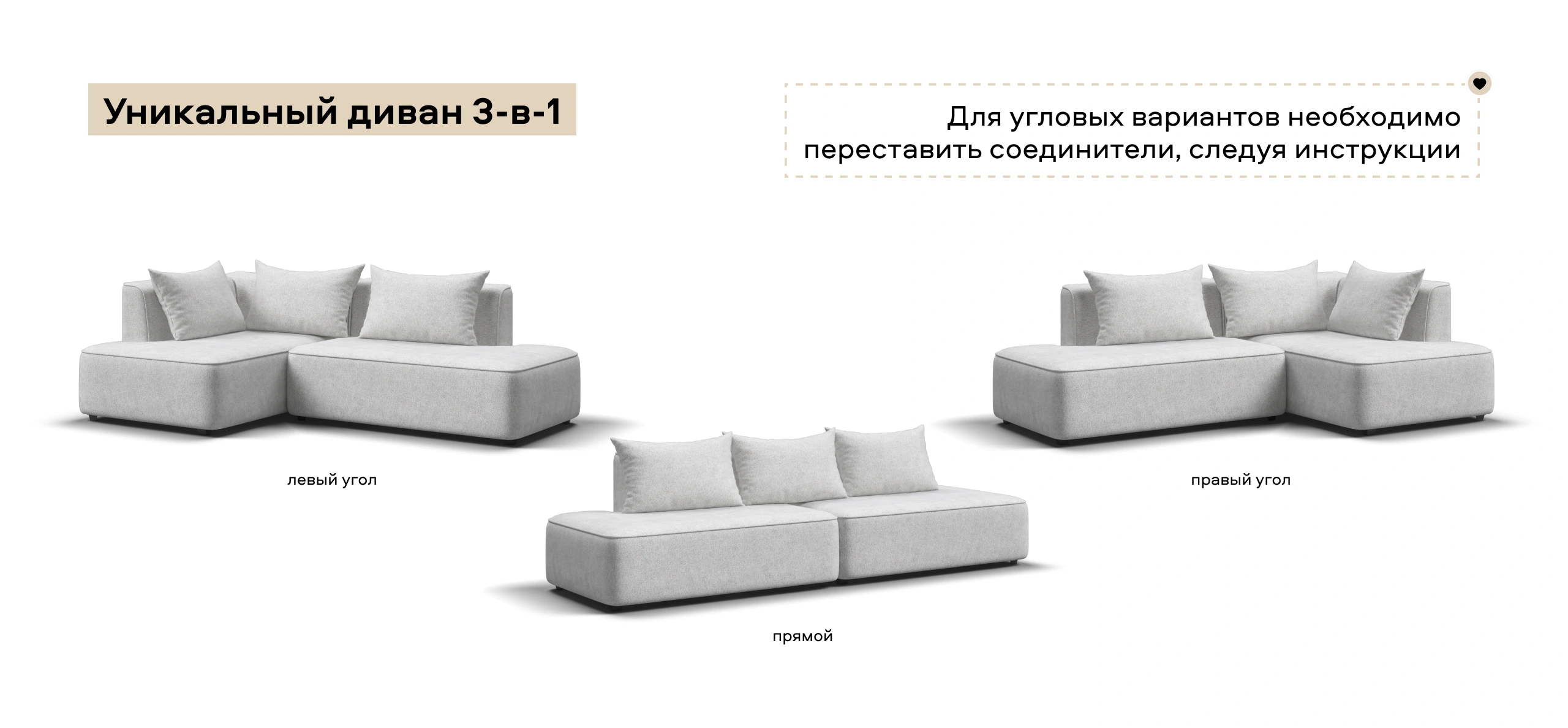 Универсальный дизайн 3-в-1 позволяет быстро менять его форму — левый угол, правый угол и прямой — всё для Вашего комфорта.
