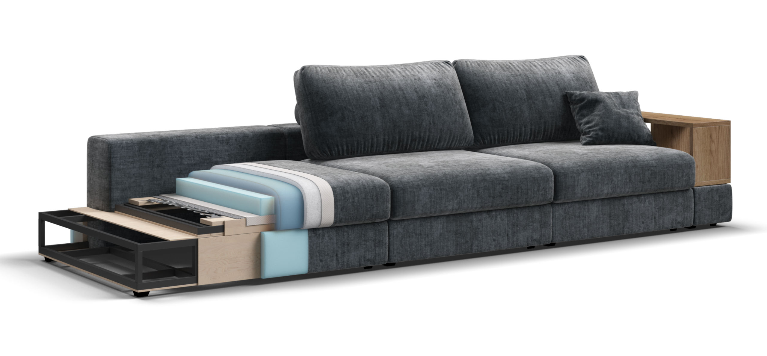 Металлический каркас обеспечивает долговечность и надежность. Диван выполнен с учетом последних требований в области экологии – не содержит ЛДСП, бельевые ящики из биоразлагаемого текстиля. Съёмные аксессуары помогут настроить необходимый вам функционал.