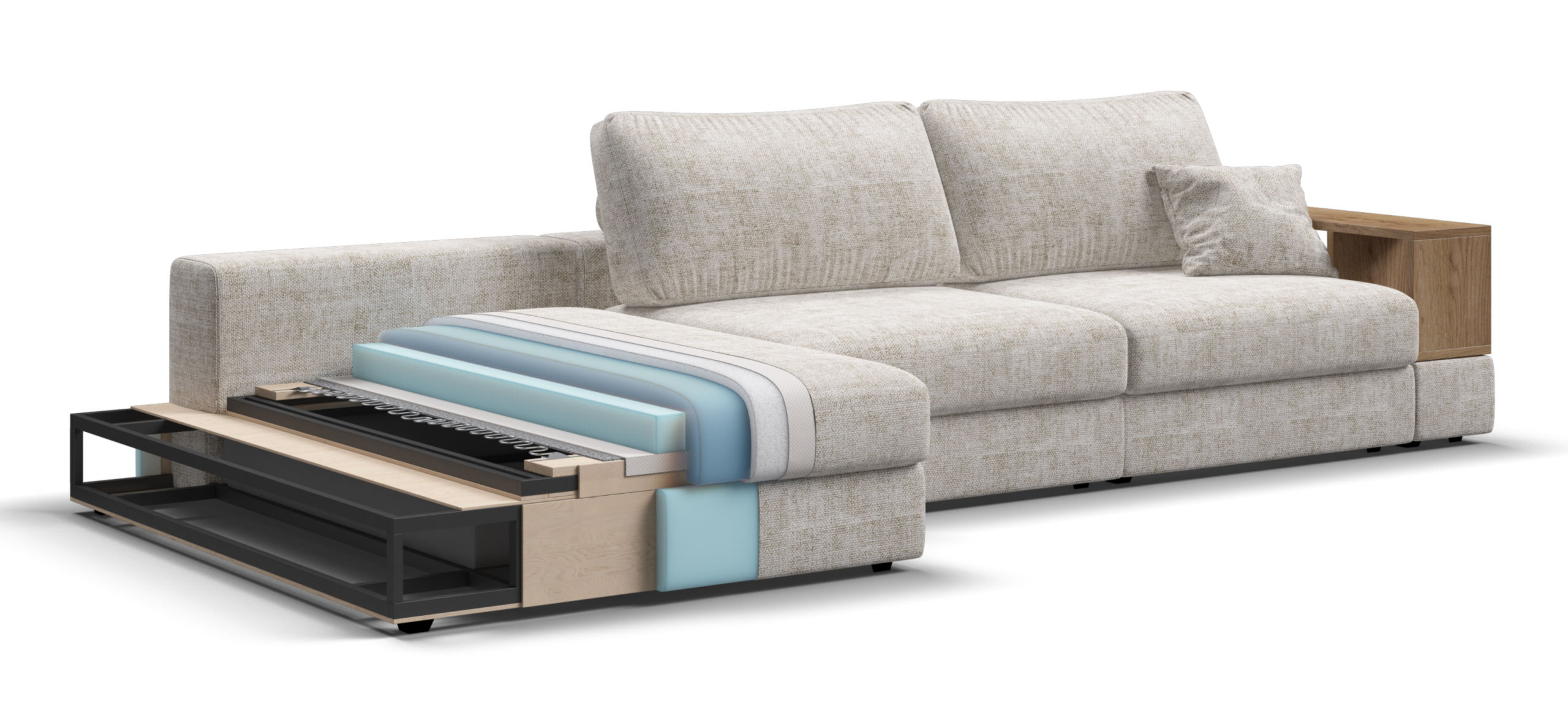 Металлический каркас обеспечивает долговечность и надежность. Диван выполнен с учетом последних требований в области экологии – не содержит ЛДСП, бельевые ящики из биоразлагаемого текстиля. Съёмные аксессуары помогут настроить необходимый вам функционал.