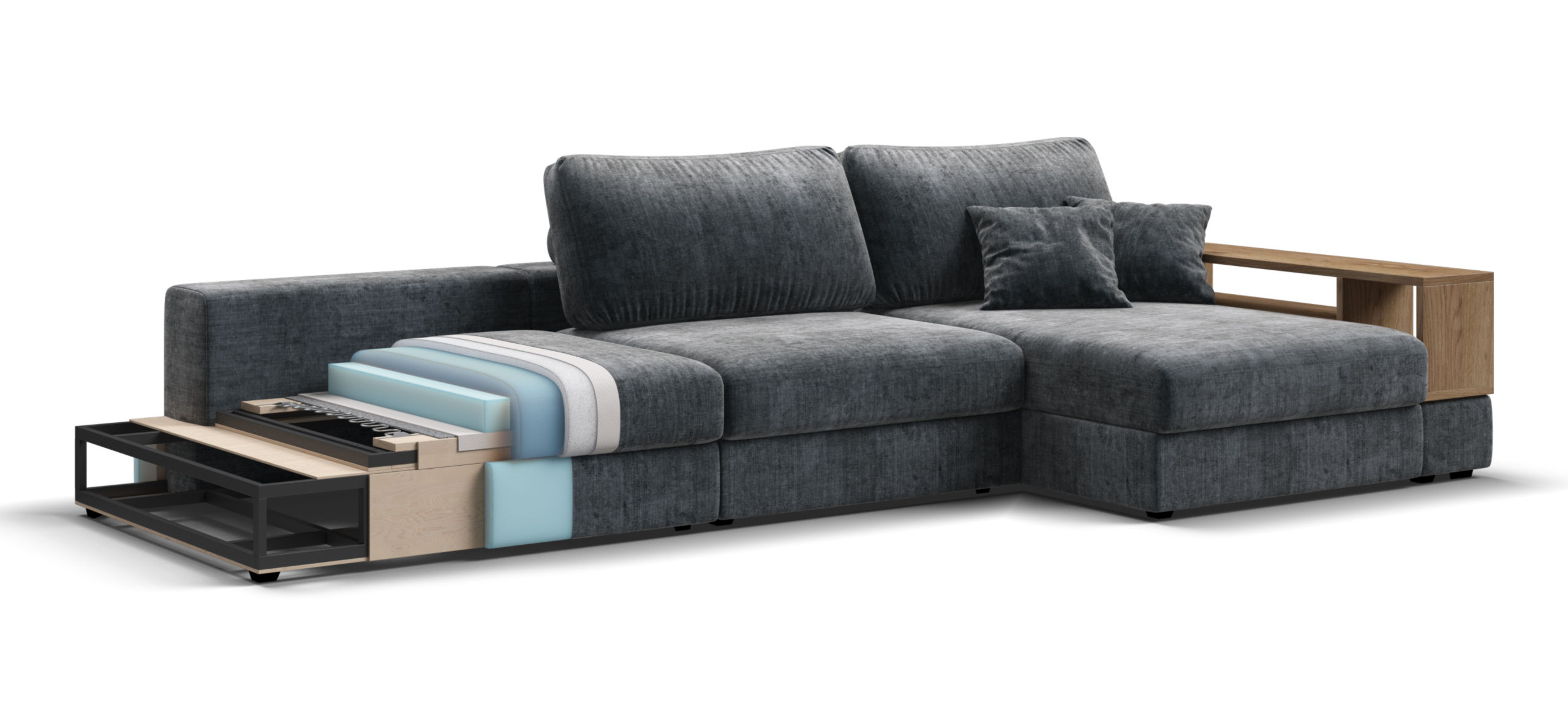 Металлический каркас обеспечивает долговечность и надежность. Диван выполнен с учетом последних требований в области экологии – не содержит ЛДСП, бельевые ящики из биоразлагаемого текстиля. Съёмные аксессуары помогут настроить необходимый вам функционал.
