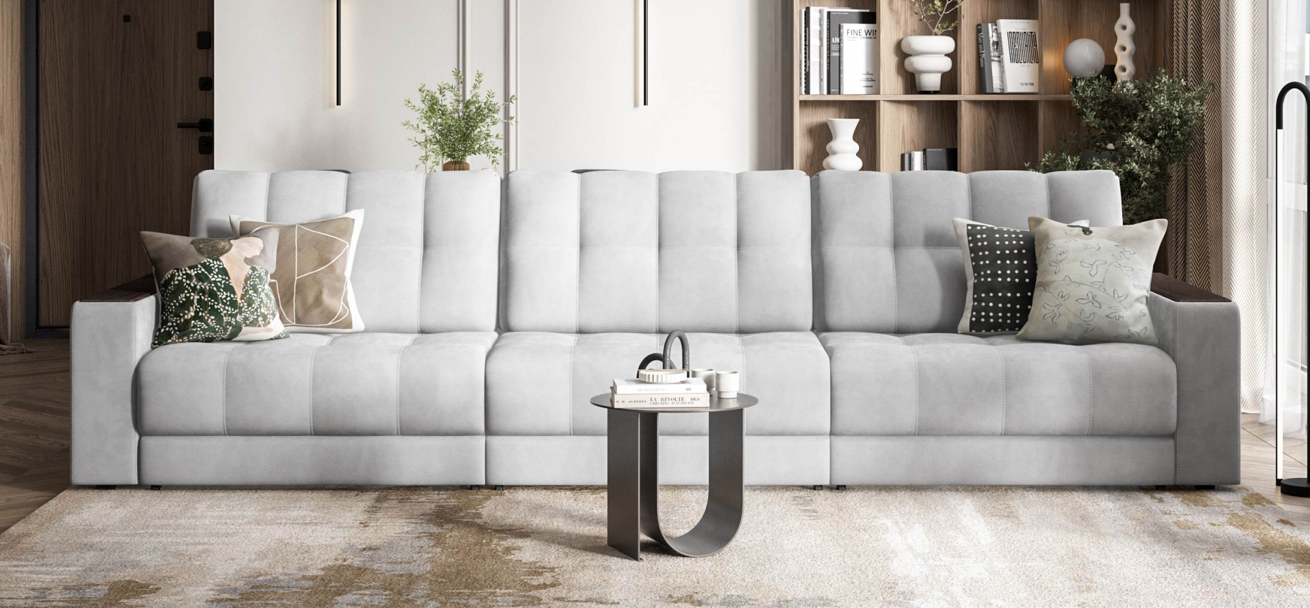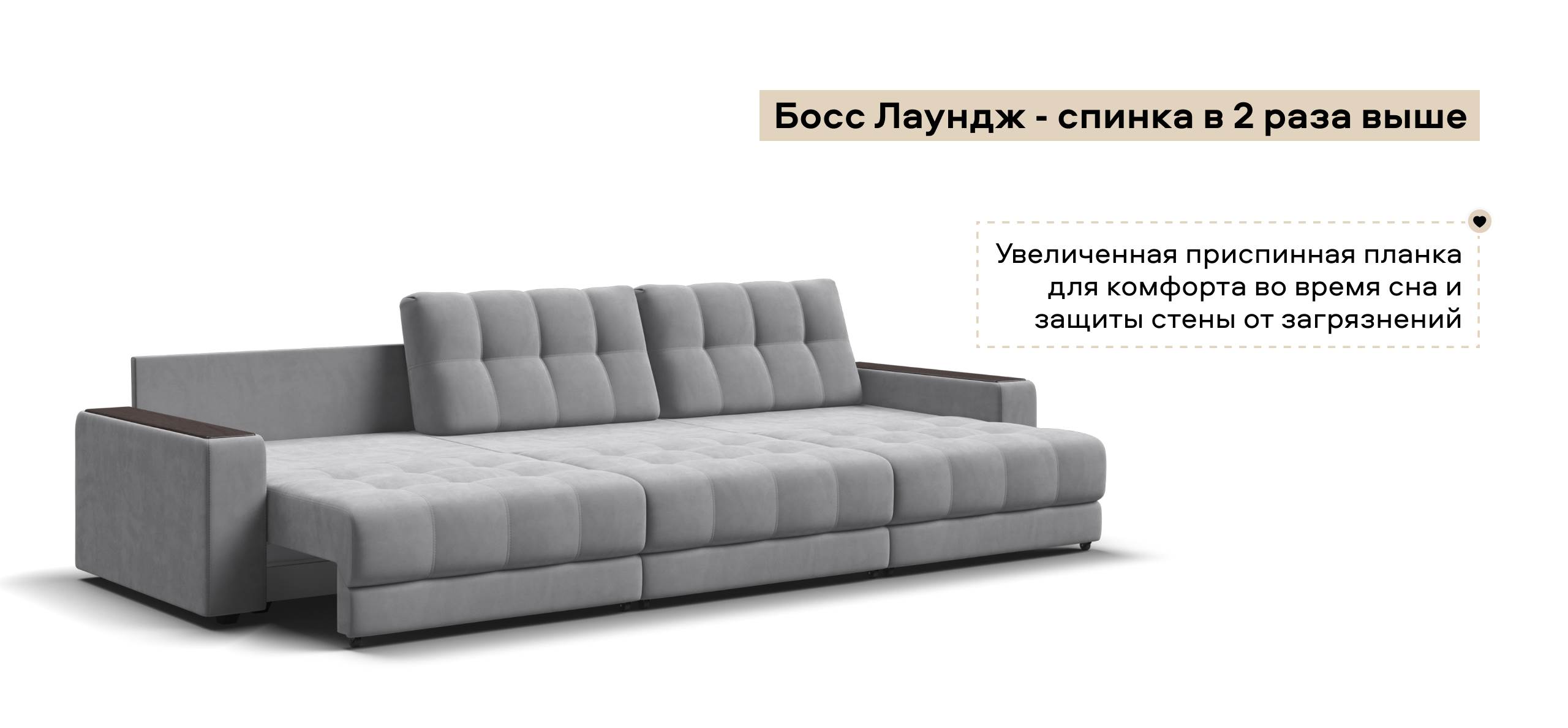 Диван Босс Гранд - большой, стильный и комфортный диван, предназначенный для просторной комнаты. Продуманный до мелочей диван Босс сочетает в себе надежный каркас, мягкие ткани, многофункциональность и быструю сборку за 1 минуту без инструментов - ощутите комфорт у себя дома!