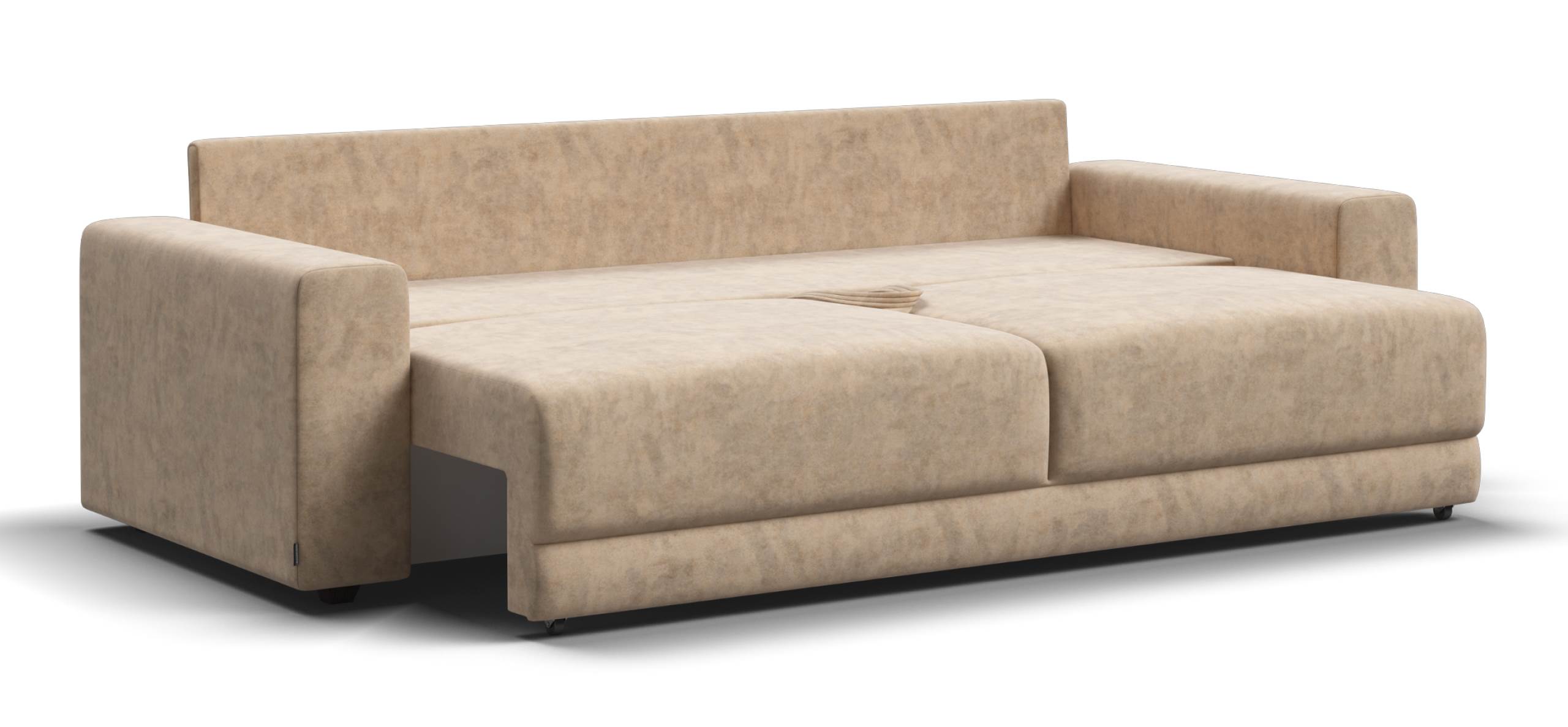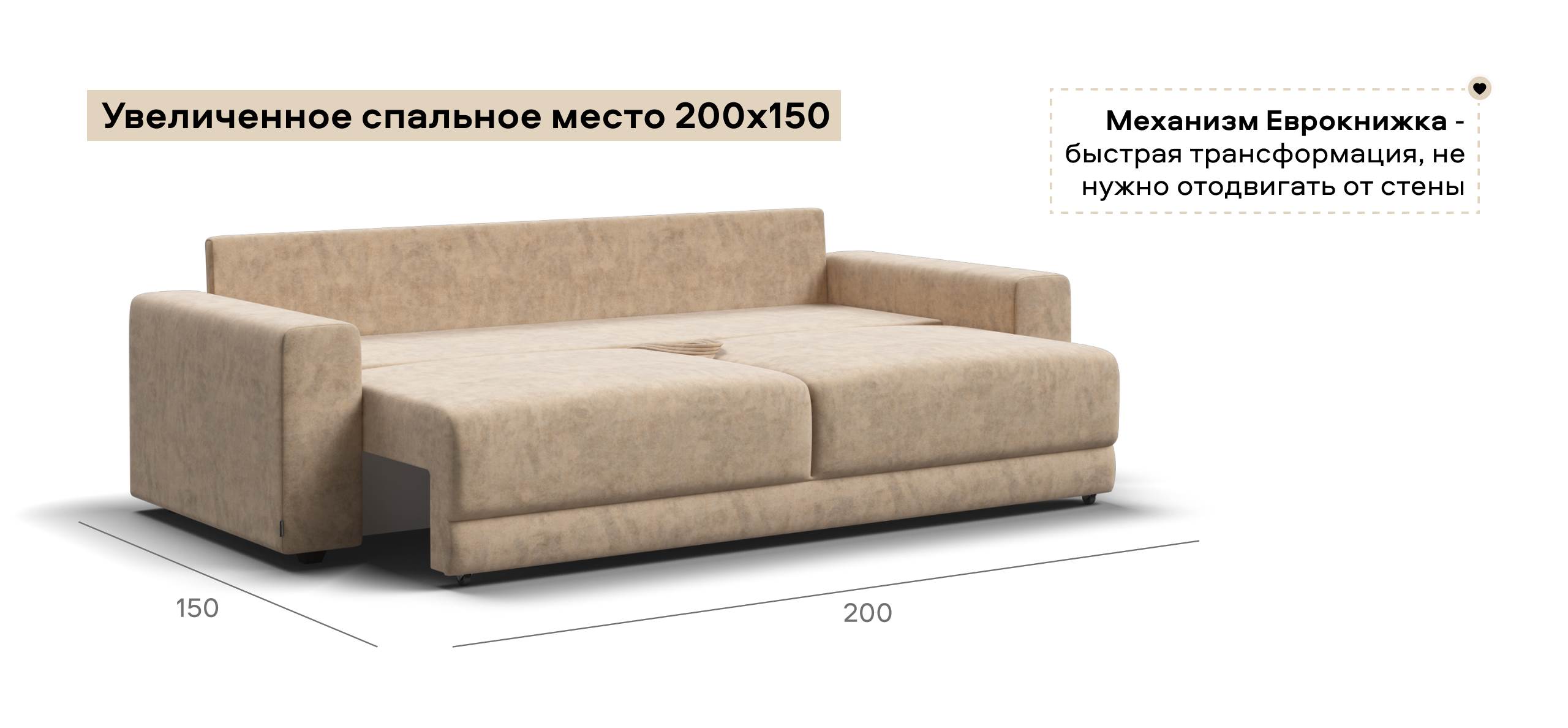 Оснащённый независимым пружинным блоком и высокоэластичной пеной Эластик Фоам с дополнительным слоем периотека, диван гарантирует анатомическую поддержку и комфортный сон. Простой и надёжный механизм трансформации «еврокнижка» позволяет легко преобразовать диван в просторное спальное место.