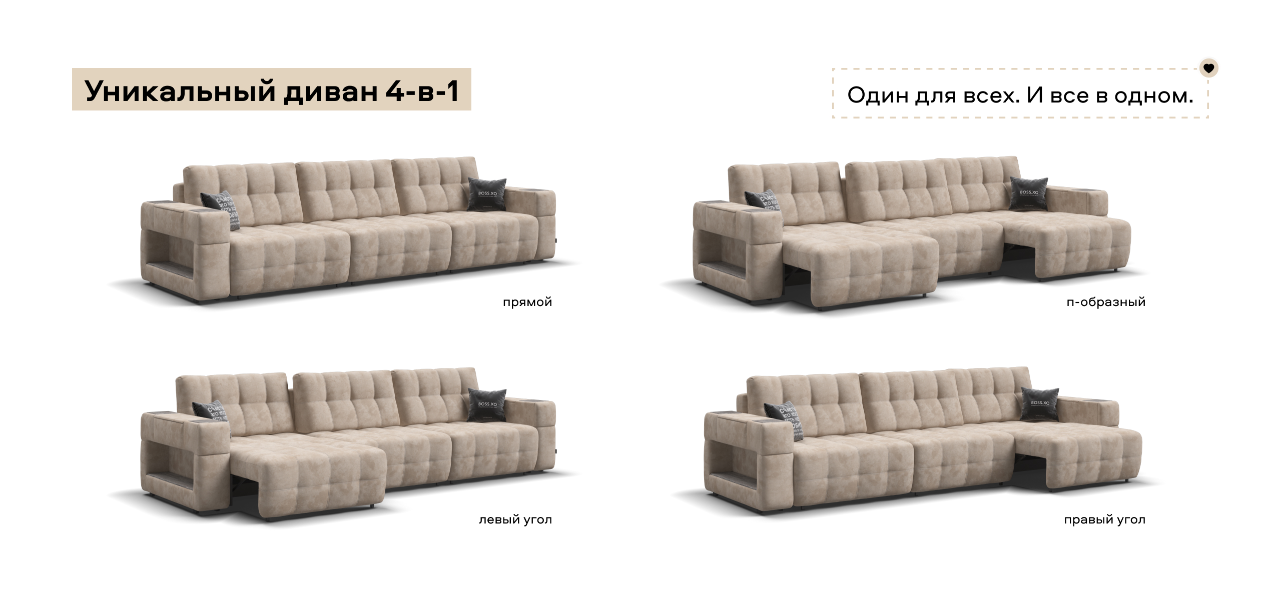Босс ХО Макс - это и прямой, угловой и П-образный диван сразу, за 10 секунд вы можете превратить его в правый или левый угол, а также в П-образный.