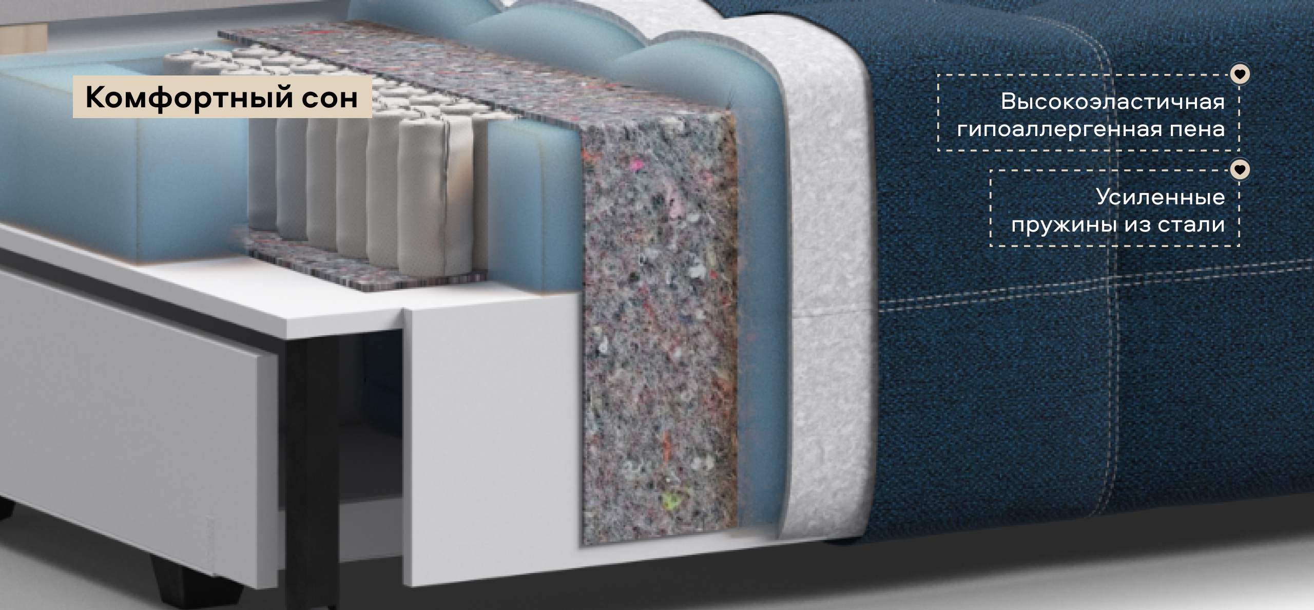 Простой и надежный механизм трансформации еврокнижка позволяет с легкостью раскладывать диван в удобную, полноценную, двуспальную кровать с идеально ровным спальным местом.