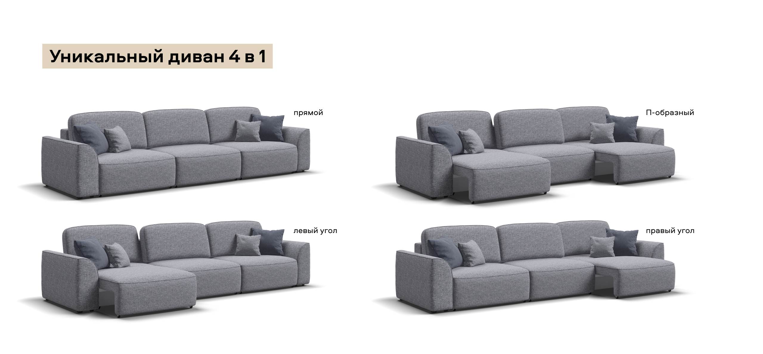 Приглашайте в гости большую компанию - диван вместит всех! Каждое посадочное место можно выдвинуть вперед и получить диван с правым или левым углом, а также получить П-образную форму дивана. А в разложенном виде диван превращается в огромное спальное место.