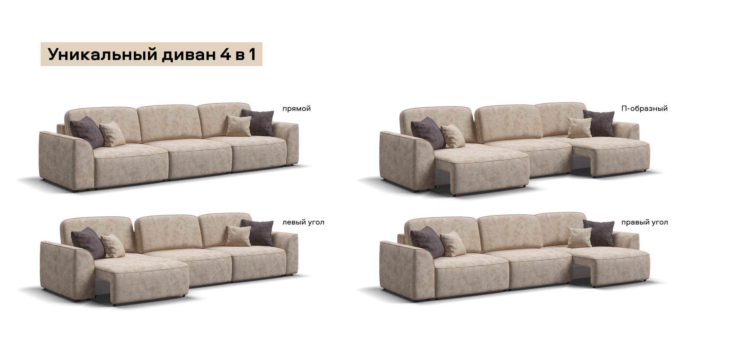 Приглашайте в гости большую компанию - диван вместит всех! Каждое посадочное место можно выдвинуть вперед и получить диван с правым или левым углом, а также получить П-образную форму дивана. А в разложенном виде диван превращается в огромное спальное место.