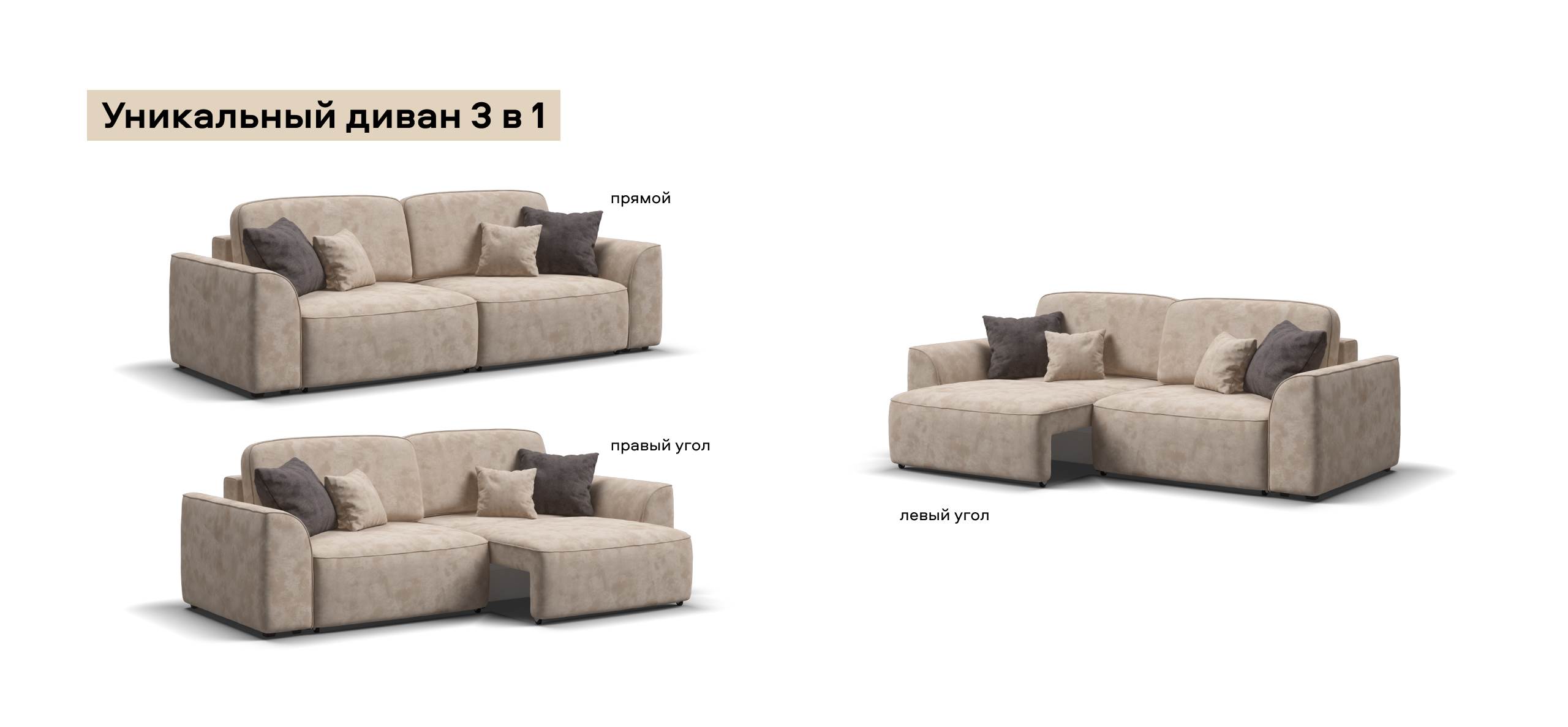 Комфортная посадка, скругленные линии, объемные подушки - диван, который наполнит ваш дом уютом и комфортом. Каждое посадочное место можно выдвинуть вперед и получить угловой диван, на котором с комфортом разместится небольшая компания. А в разложенном виде диван превращается в комфортное спальное место.