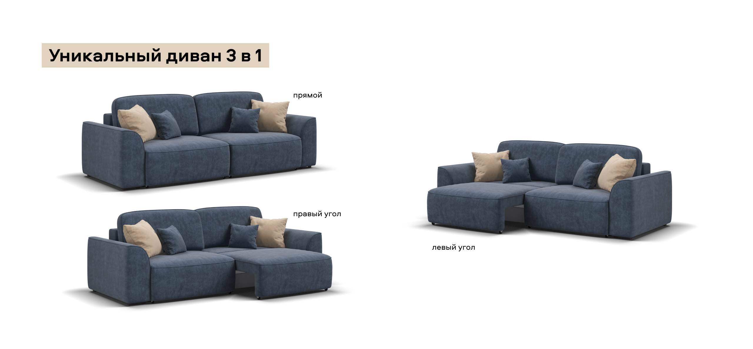 Комфортная посадка, скругленные линии, объемные подушки - диван, который наполнит ваш дом уютом и комфортом. Каждое посадочное место можно выдвинуть вперед и получить угловой диван, на котором с комфортом разместится небольшая компания. А в разложенном виде диван превращается в комфортное спальное место.