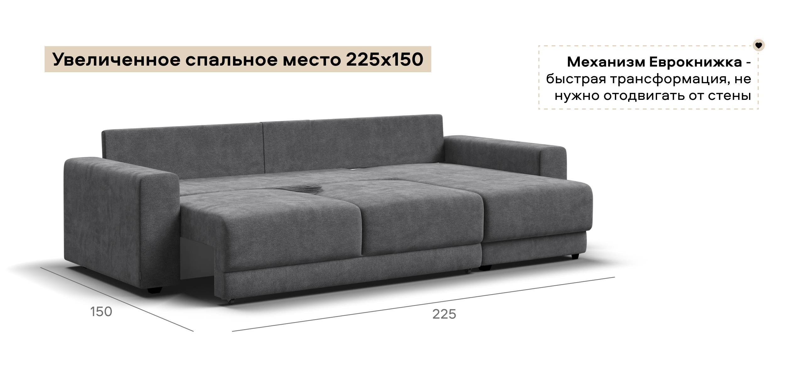 Простой и надежный механизм еврокнижка позволяет ставить диван вплотную к стене