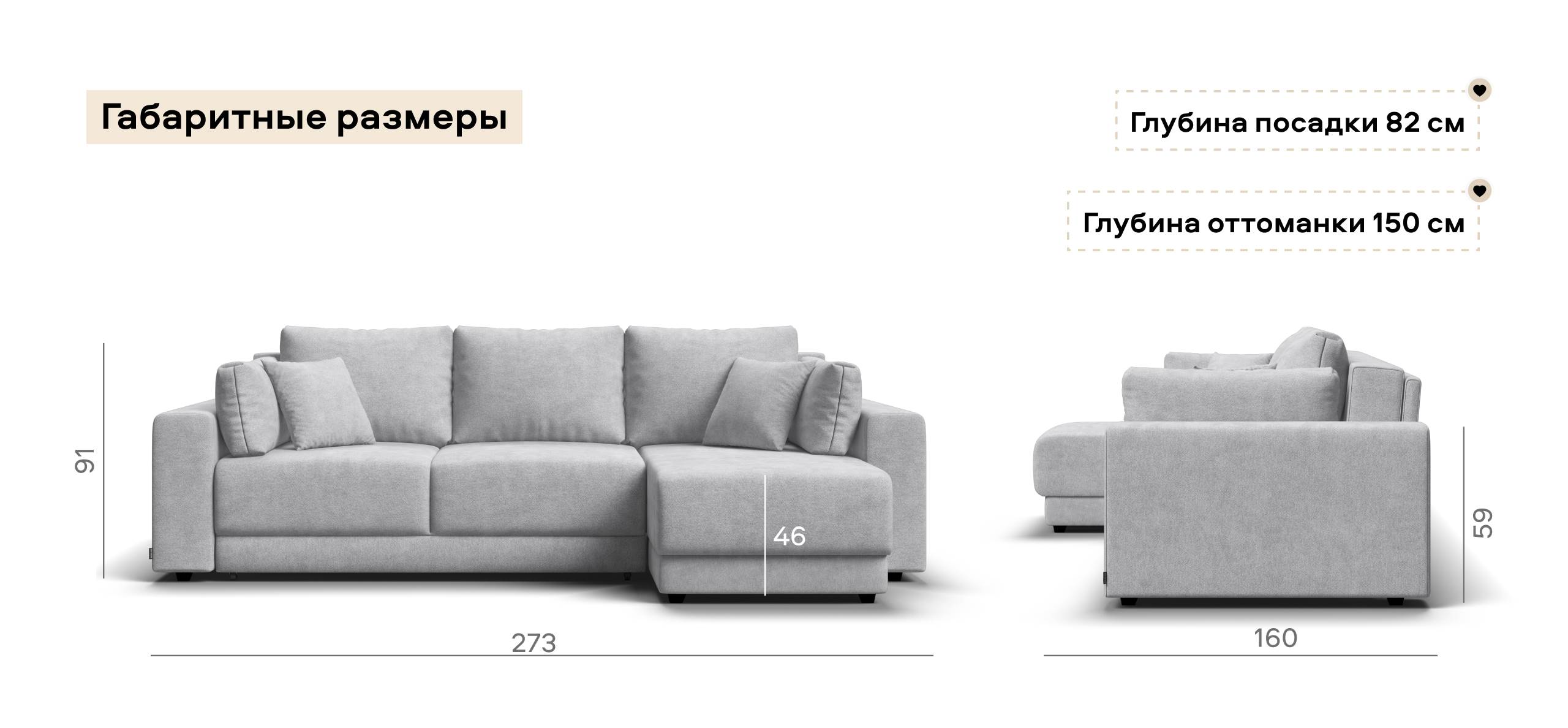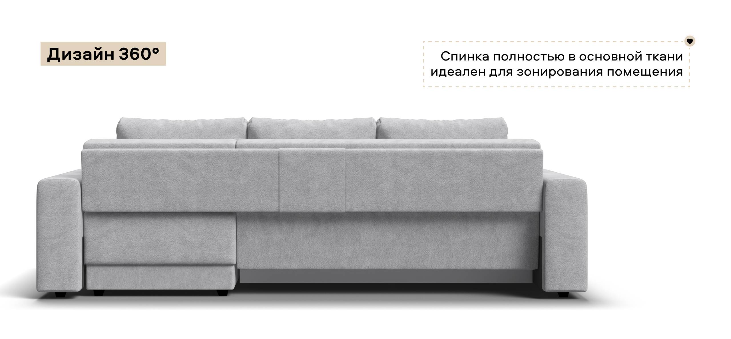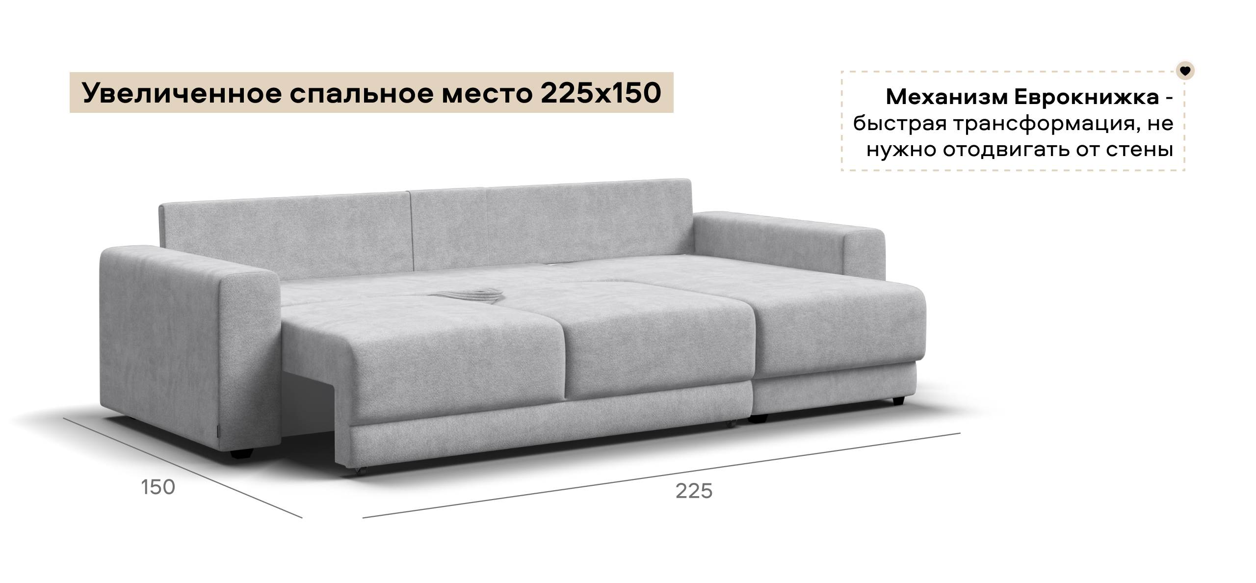 Оснащённый независимым пружинным блоком и высокоэластичной пеной Эластик Фоам с дополнительным слоем периотека, диван гарантирует анатомическую поддержку и комфортный сон. Простой и надёжный механизм трансформации «еврокнижка» позволяет легко преобразовать диван в просторное спальное место.​ Универсальный угол позволит Вам переставить оттоманку и поменять положение угла при необходимости.
