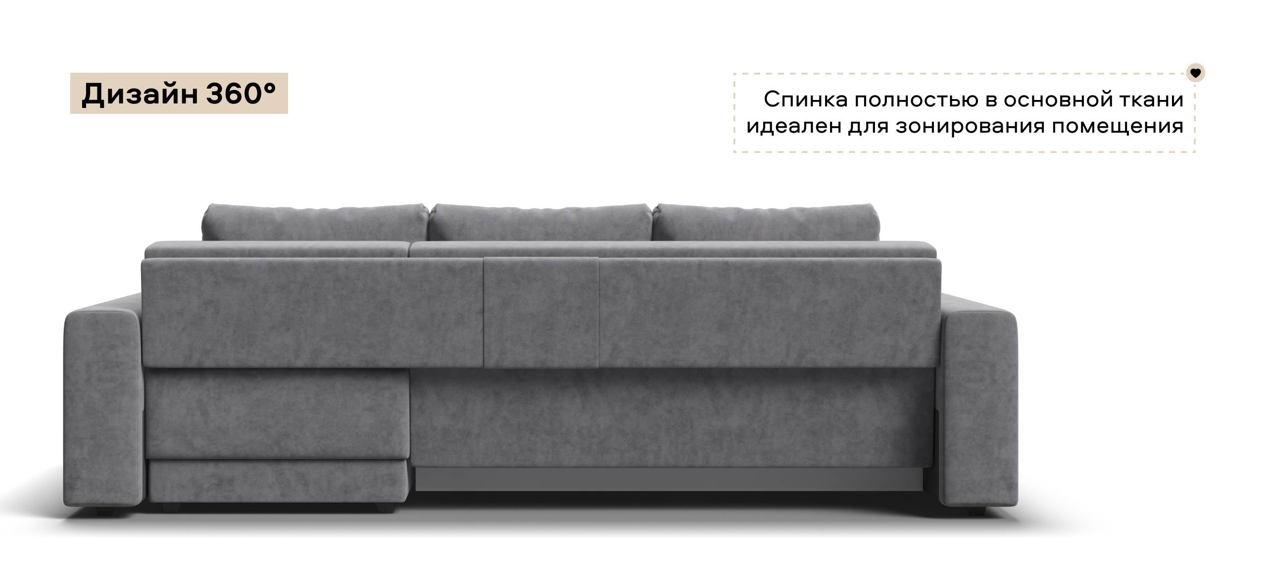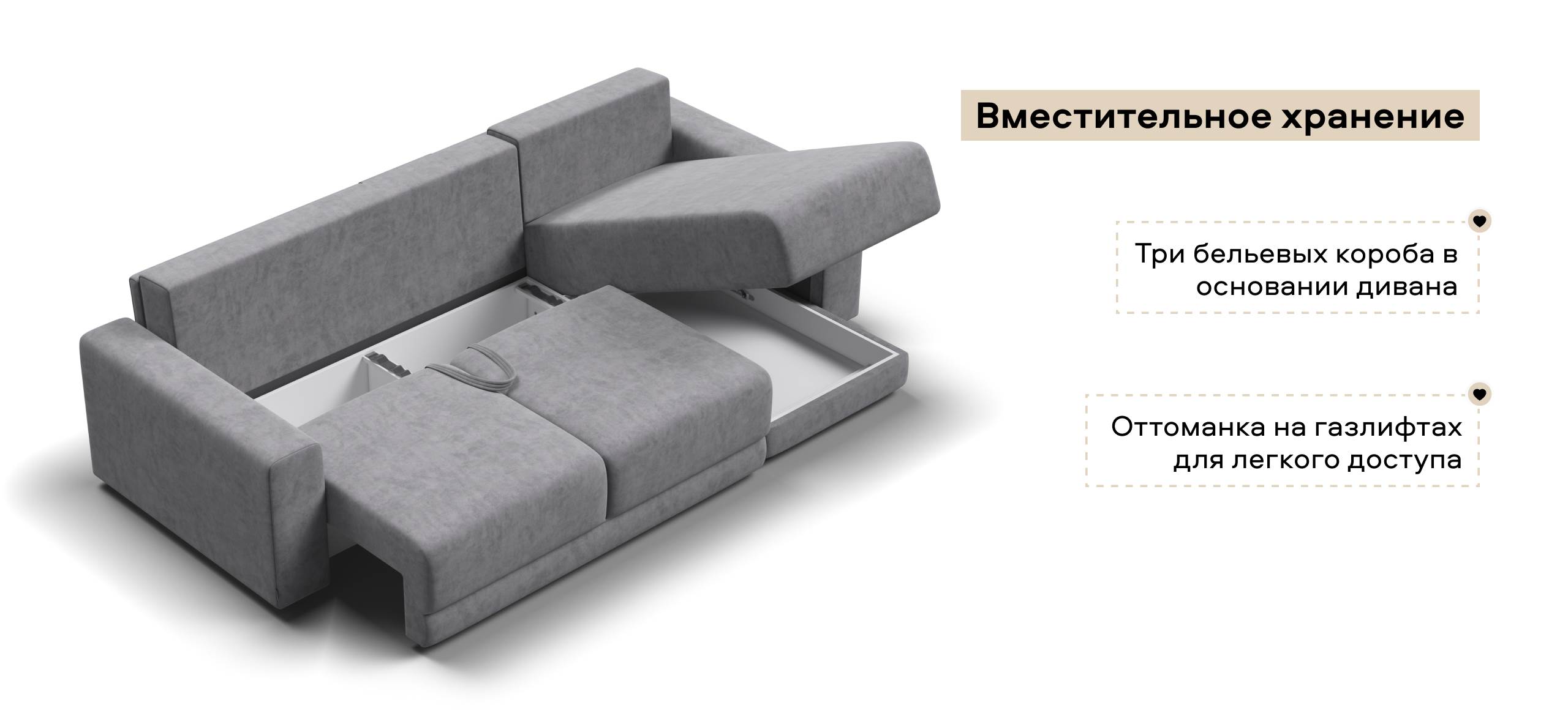 Оснащённый независимым пружинным блоком и высокоэластичной пеной Эластик Фоам с дополнительным слоем периотека, диван гарантирует анатомическую поддержку и комфортный сон. Простой и надёжный механизм трансформации «еврокнижка» позволяет легко преобразовать диван в просторное спальное место. Универсальный угол позволит Вам переставить оттоманку и поменять положение угла при необходимости.