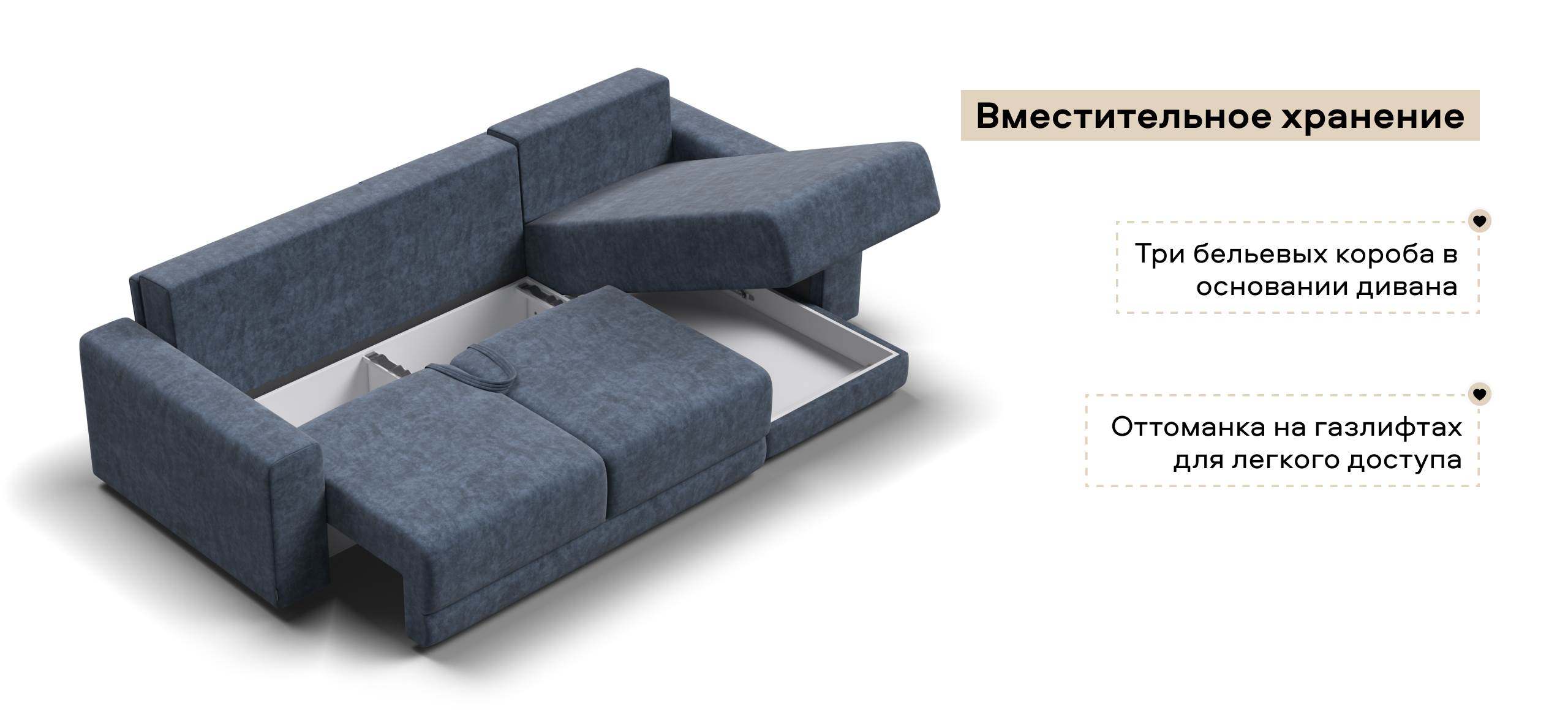 Оснащённый независимым пружинным блоком и высокоэластичной пеной Эластик Фоам с дополнительным слоем периотека, диван гарантирует анатомическую поддержку и комфортный сон. Простой и надёжный механизм трансформации «еврокнижка» позволяет легко преобразовать диван в просторное спальное место. Универсальный угол позволит Вам переставить оттоманку и поменять положение угла при необходимости.