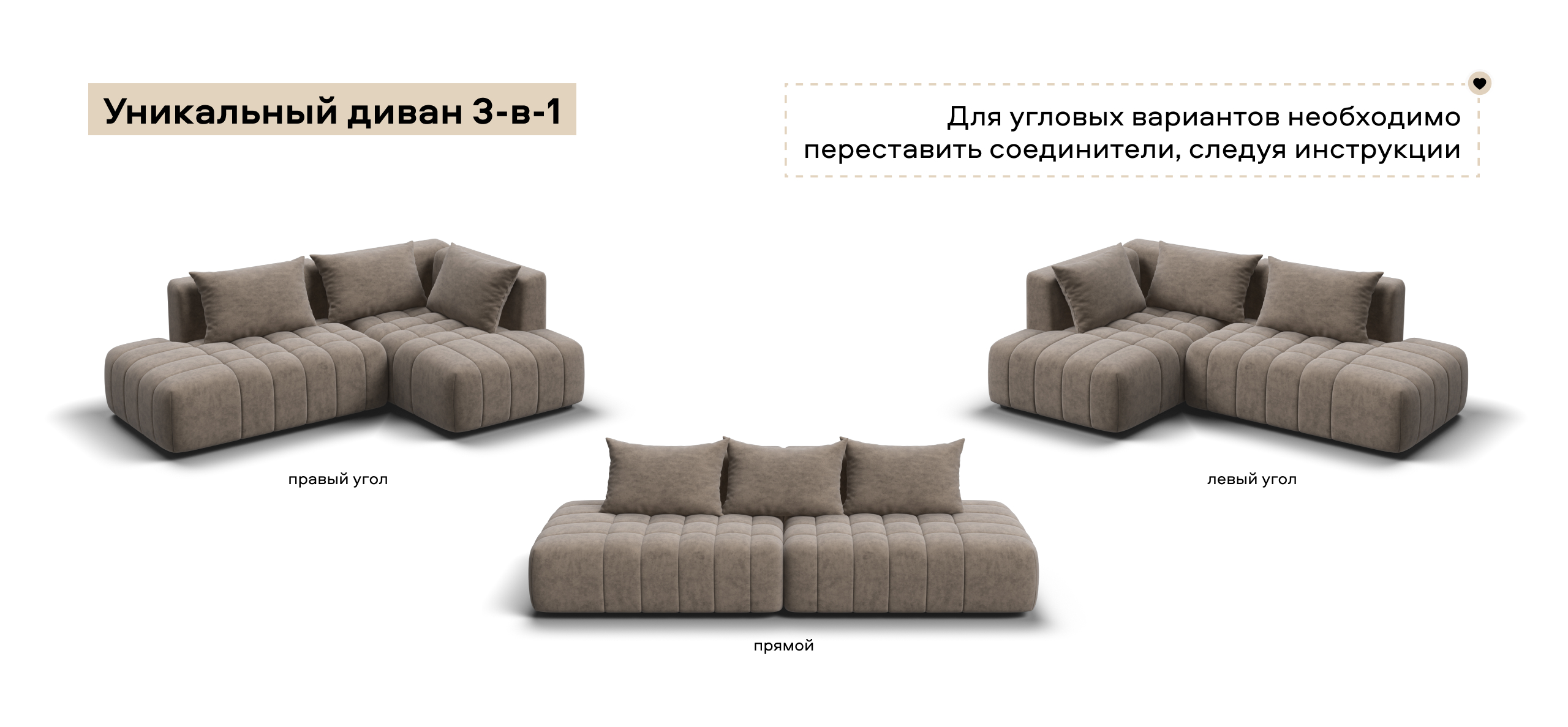 Универсальный дизайн 3-в-1 позволяет быстро менять его форму — левый угол, правый угол и прямой — всё для Вашего комфорта.