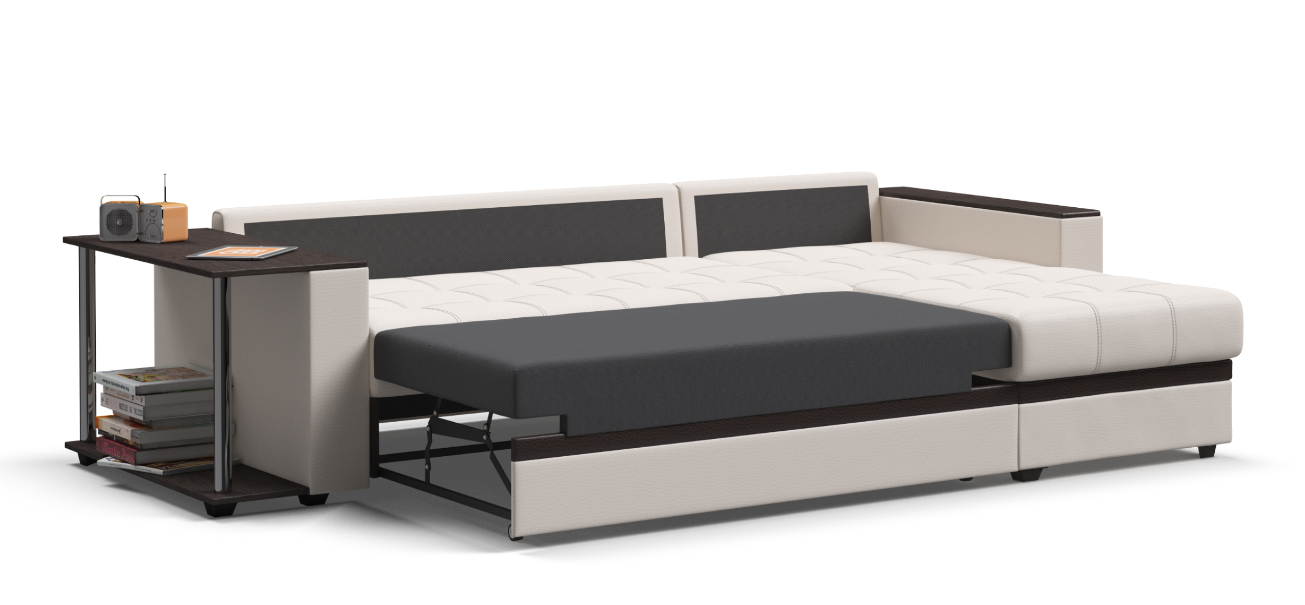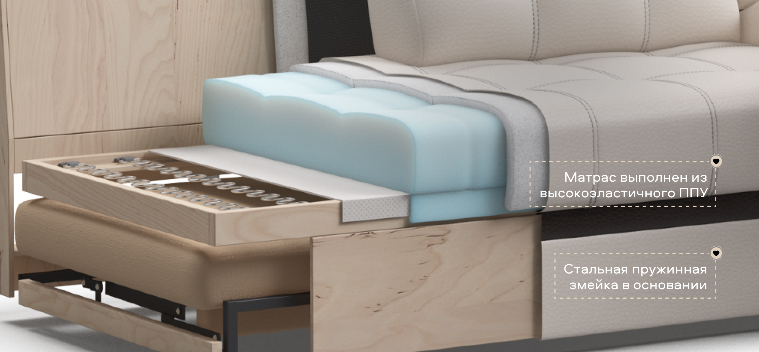 Модель оснащена прорезиненными колесиками, что обеспечит вам легкость раскладки и обезопасит от повреждений напольное покрытие. Не прилагая особых усилий, диван легко превратить в комфортную двуспальную кровать с идеально ровным спальным местом.