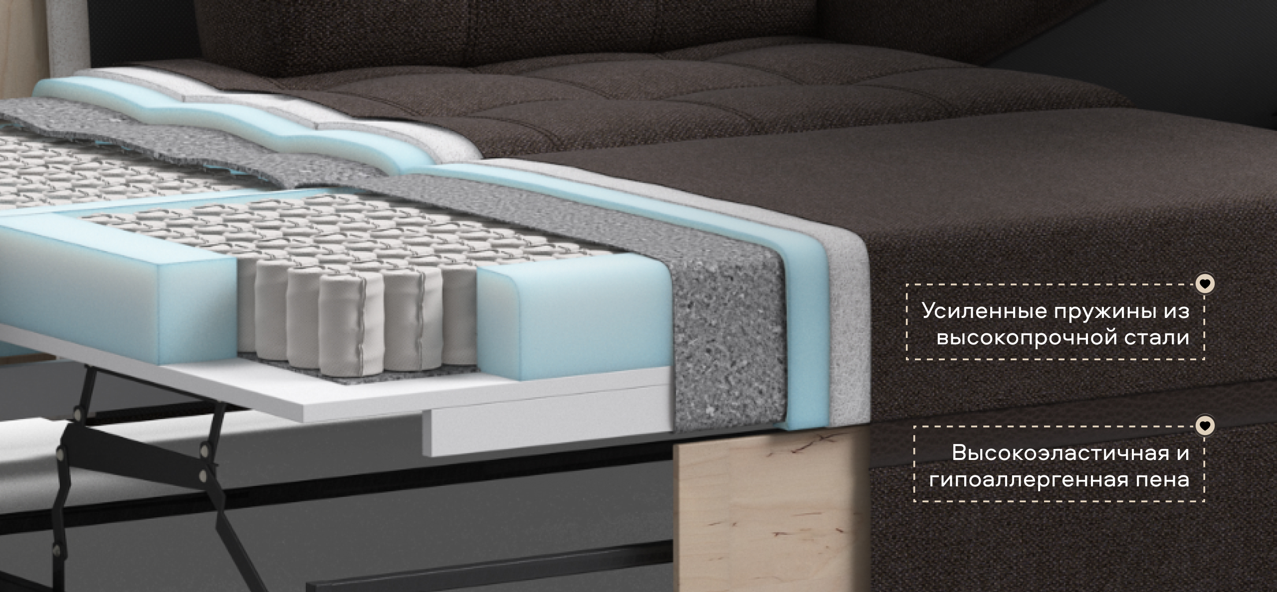 Выкатная часть выполнена на независимом пружинном блоке, обивка в основной ткани. Задняя часть спинки дивана частично выполнена в технической ткани.