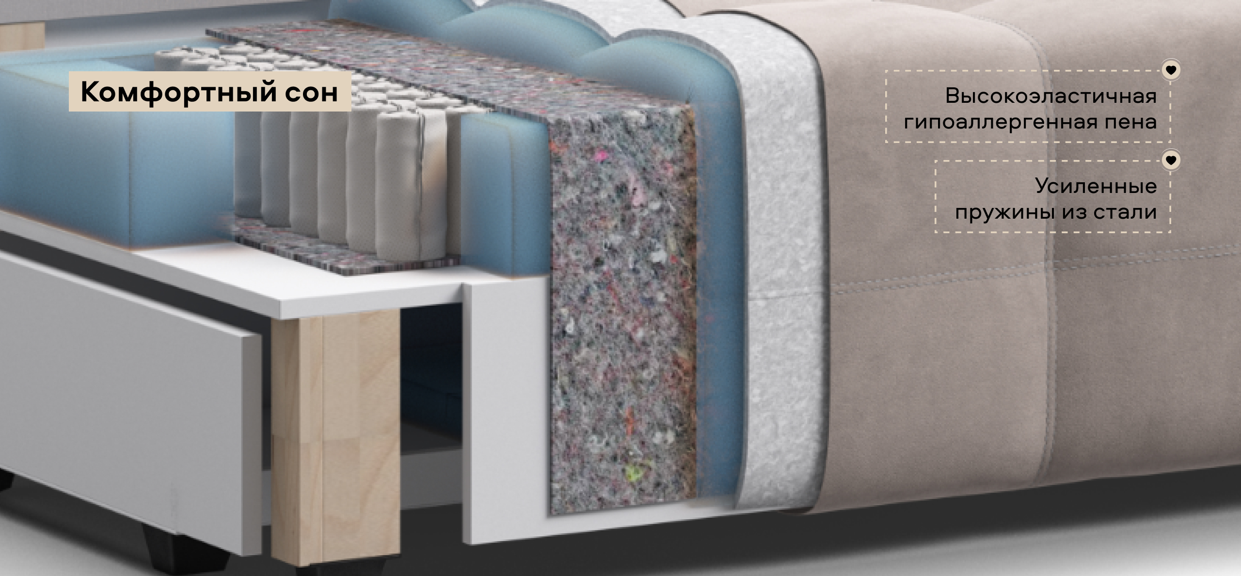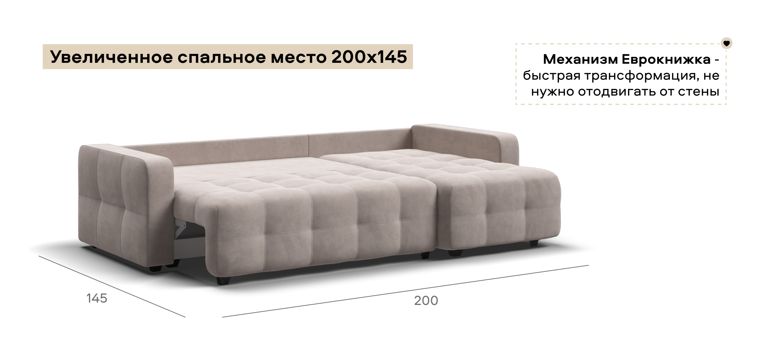Простой и надежный механизм трансформации еврокнижка позволяет с легкостью раскладывать диван в удобную, полноценную, двуспальную кровать.