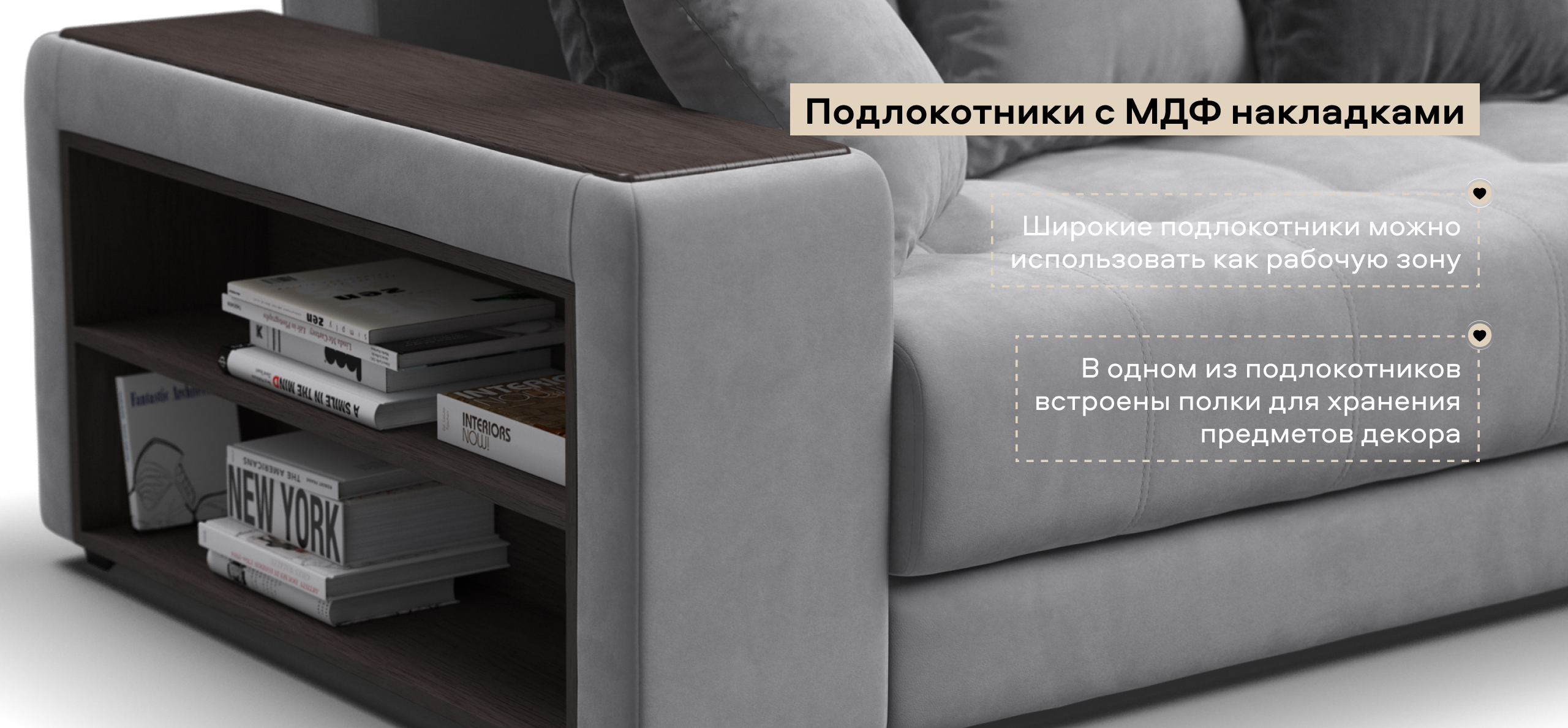 Продуманная конструкция дивана Дубай приятно порадует Вас. Широкие подлокотники имеют вставки из МДФ, благодаря чему их очень удобно использовать в качестве столика, а в одном из подлокотников размещены удобные полки для необходимых мелочей. Теперь Ваш телефон или любимая книга будут всегда под рукой.