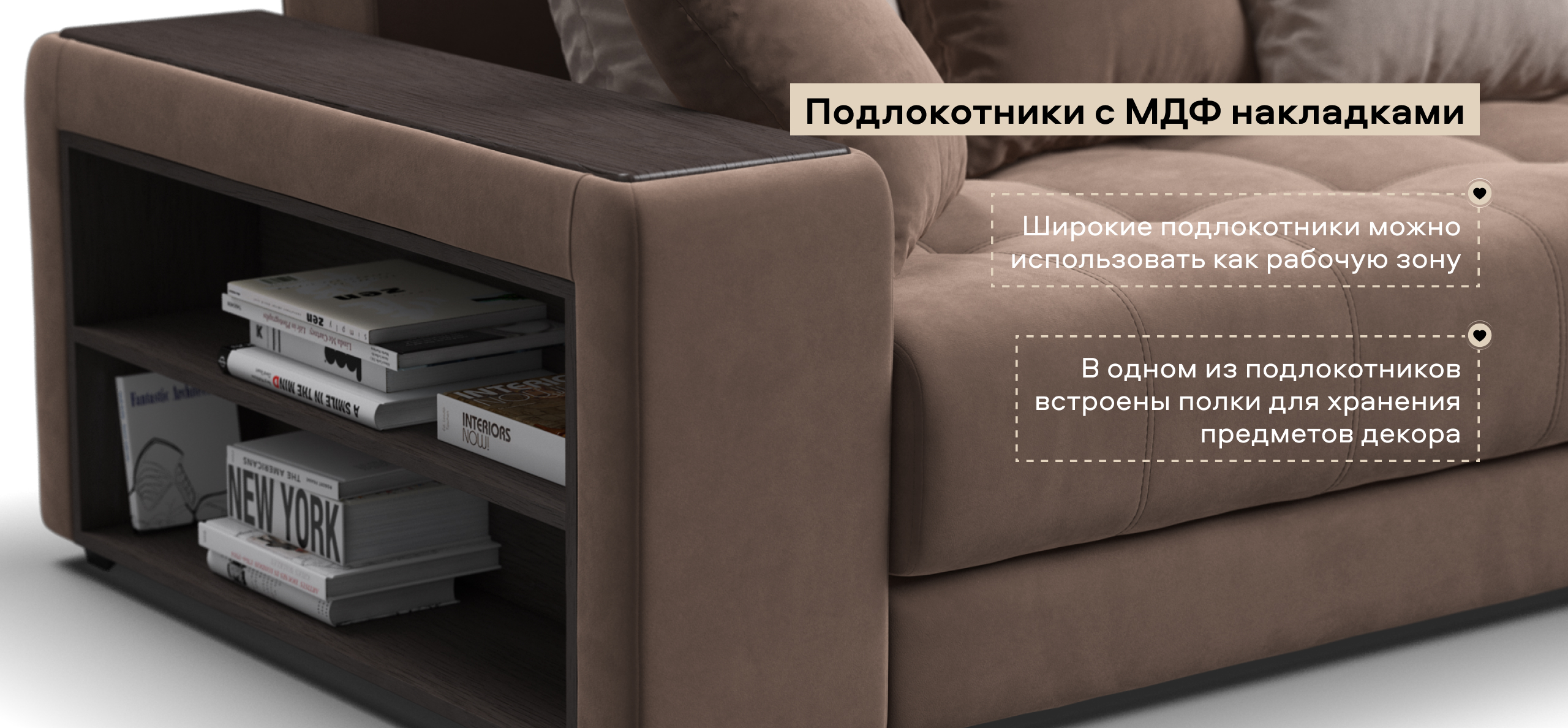 Продуманная конструкция дивана Дубай приятно порадует Вас. Широкие подлокотники имеют вставки из МДФ, благодаря чему их очень удобно использовать в качестве столика, а в одном из подлокотников размещены удобные полки для необходимых мелочей. Теперь Ваш телефон или любимая книга будут всегда под рукой.