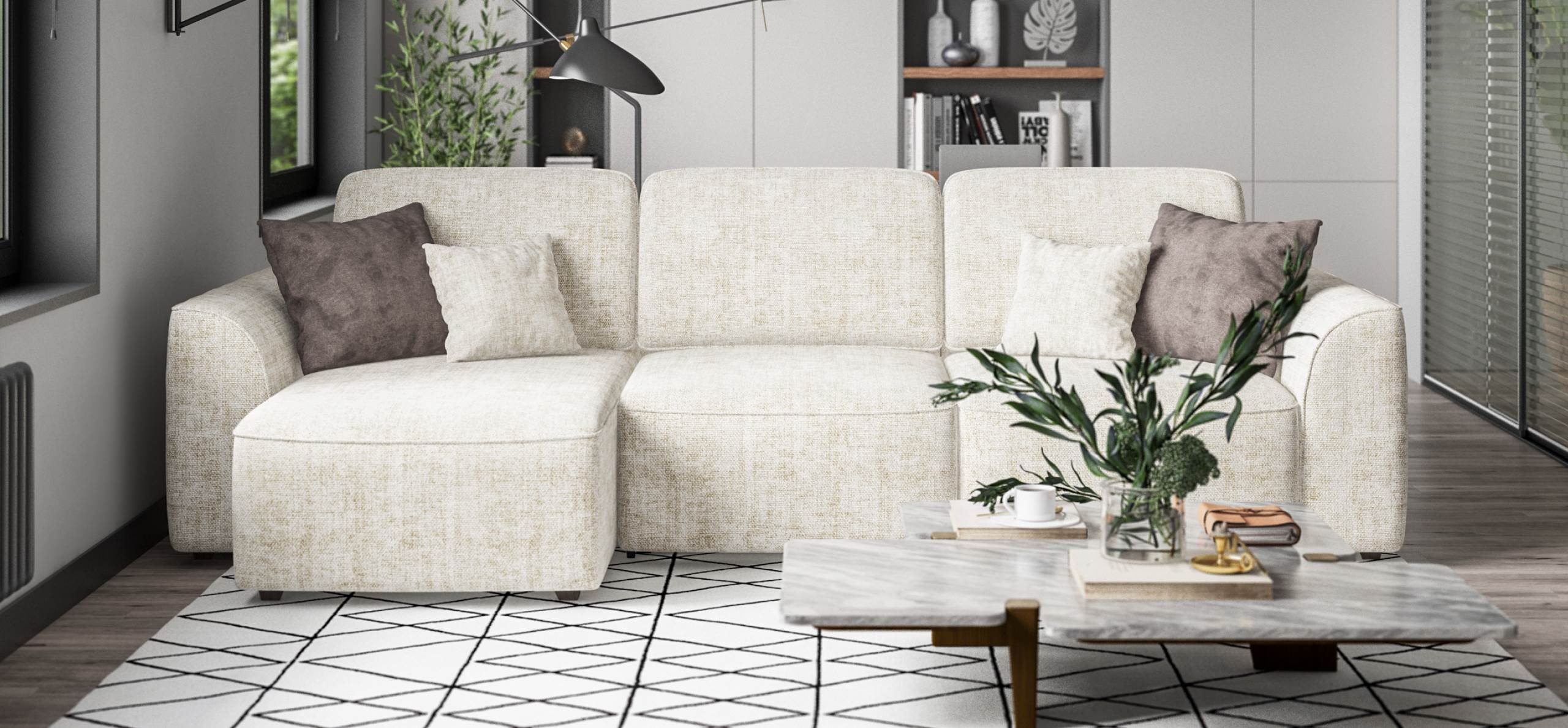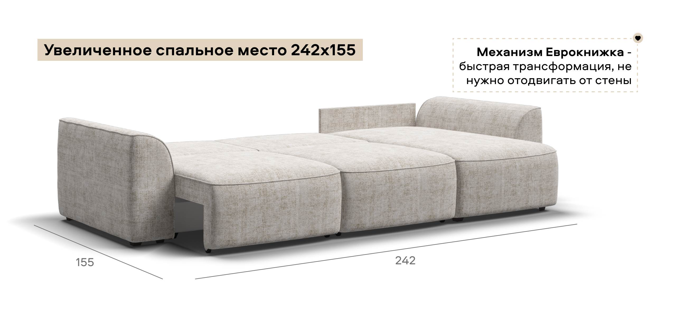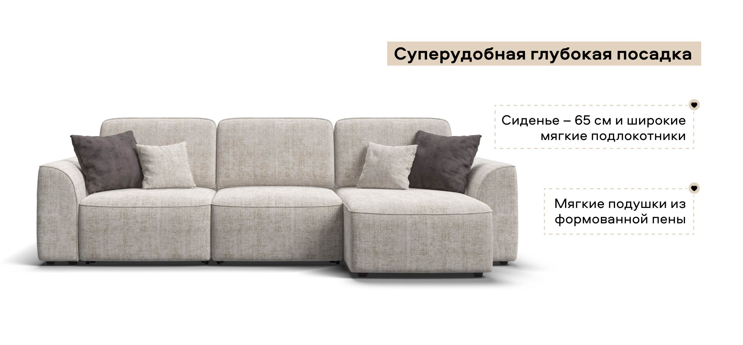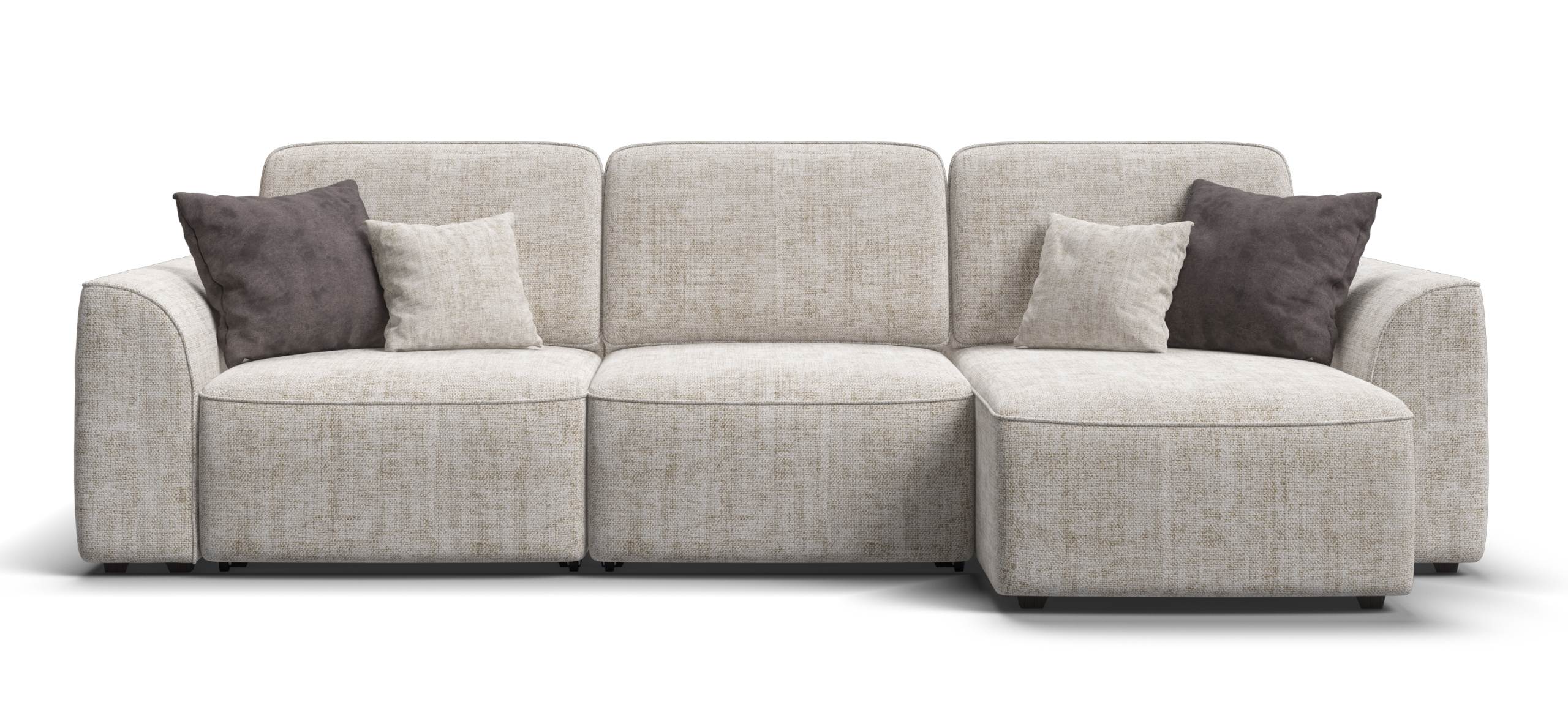 Комфортная посадка, скругленные линии, объемные подушки - диван, который наполнит ваш дом уютом и комфортом. Универсальный угол позволит Вам самостоятельно выбрать его положение при сборке, а каждое посадочное место можно выдвинуть вперед и получить П-образную форму дивана, на котором с комфортом разместится большая компания. А в разложенном виде диван превращается в комфортное спальное место.