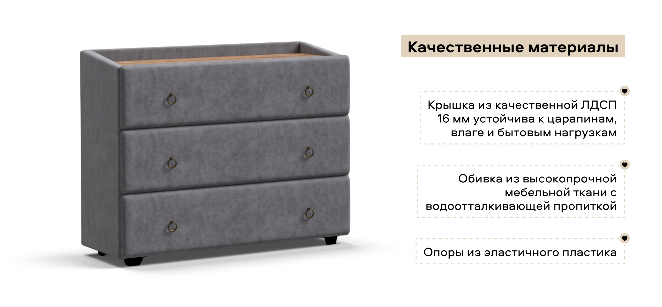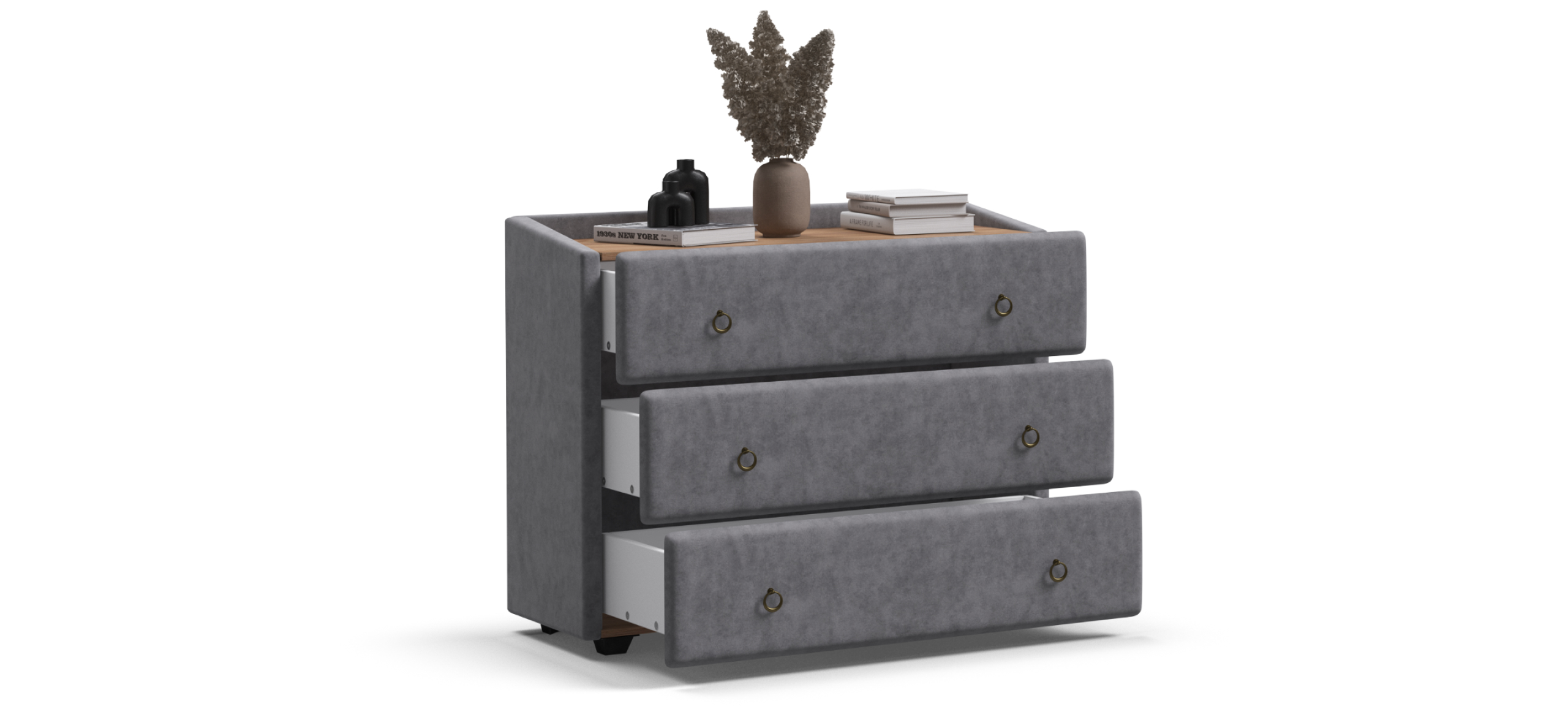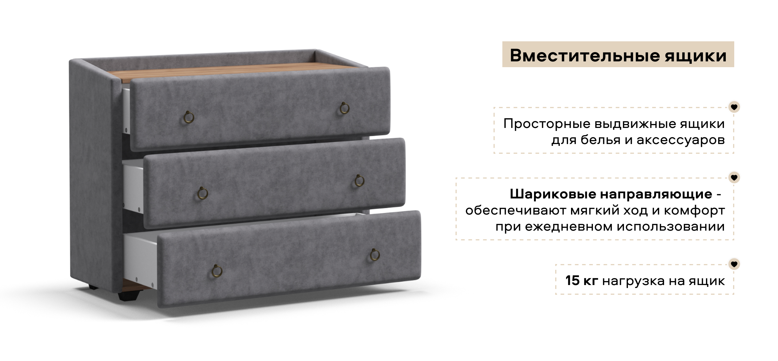 Комод Босс Классик разработан специально для вашего максимального комфорта. Три вместительных ящика из качественных материалов с усиленными направляющими скрытого монтажа для хранения вещей. Продуманный дизайн комода с высоким бортиком защитит ваши ценные вещи от падения, а дизайнерская ручка подчеркнет изысканный вкус владельца. Новые цвета ЛДСП в теплом и холодном оттенке подобраны специально под наши ткани.