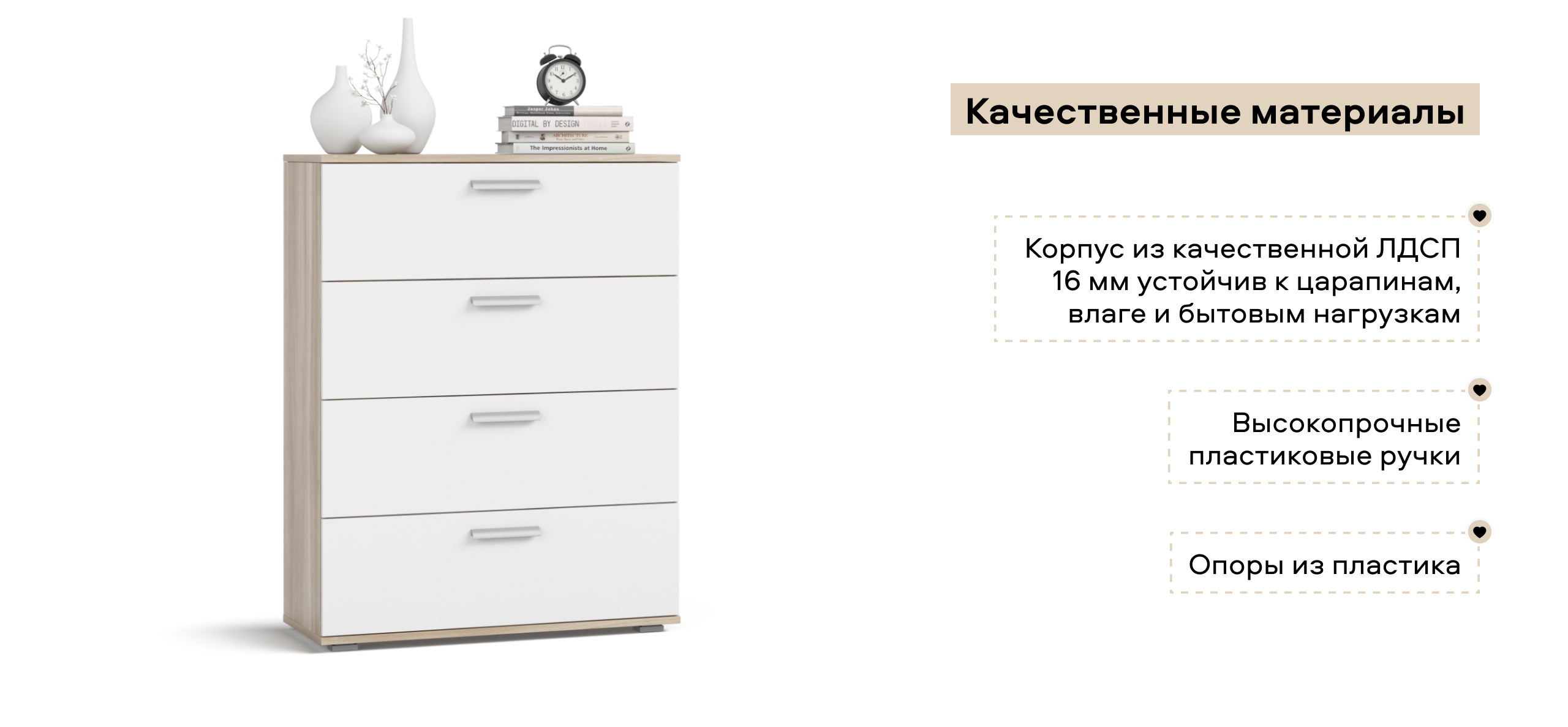Практичный и стильный предмет домашнего интерьера. Мебель сделана из прочного материала ЛДСП, характеризуется лаконичным, универсальным исполнением. Вместительные ящики удобны для хранения белья, аксессуаров и прочих предметов гардероба. Комод будет хорошо смотреться в спальне, гостиной, домашней столовой, прихожей или кабинете, оформленном в современном стиле.