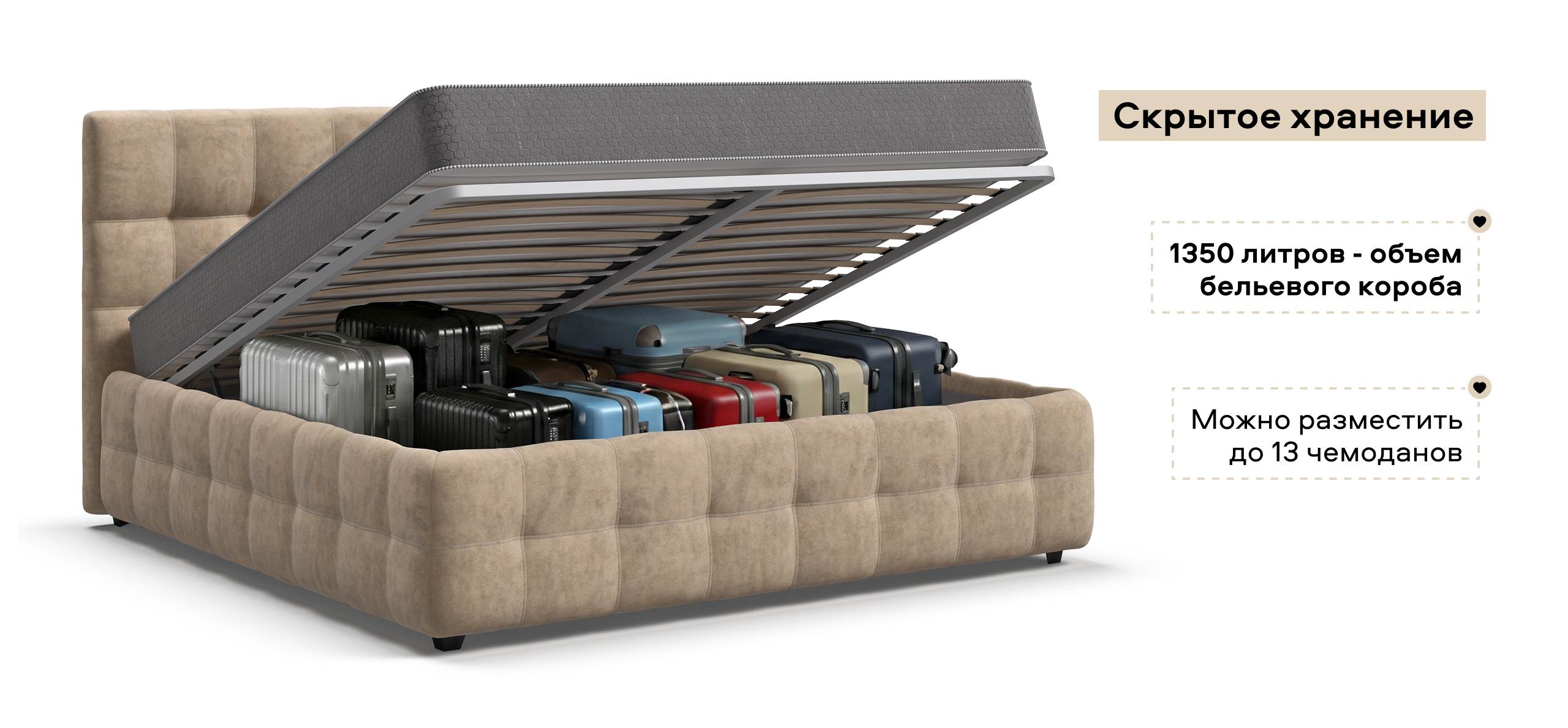 Одним из главных преимуществ кровати Босс является её усиленное ортопедическое основание HEALTHY SLEEP, которое обеспечивает правильную поддержку позвоночника и улучшает качество сна. Благодаря вместительному отсеку для хранения HideBox, объёмом в 1250 литров, у вас будет достаточно пространства для хранения постельного белья и других вещей, что позволяет максимально эффективно использовать пространство спальни.
