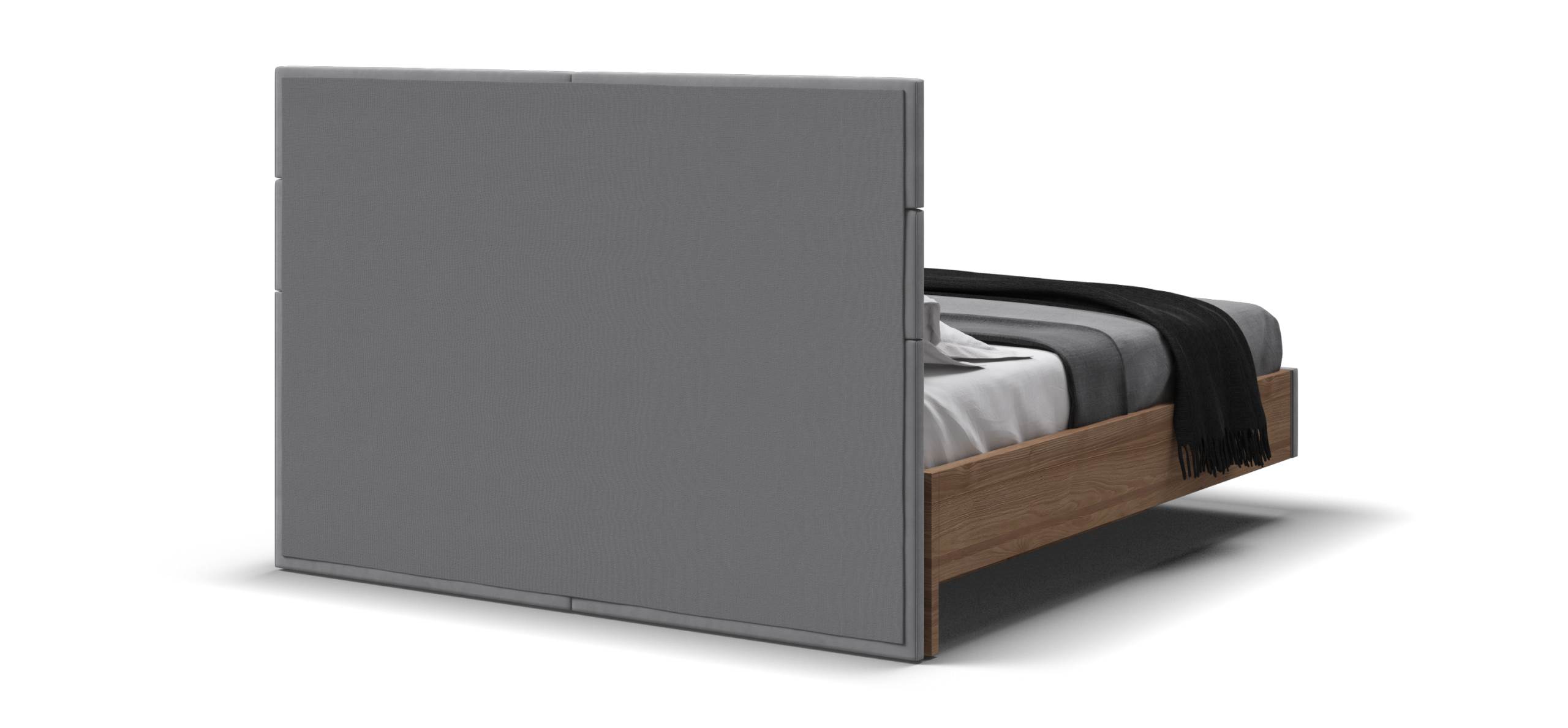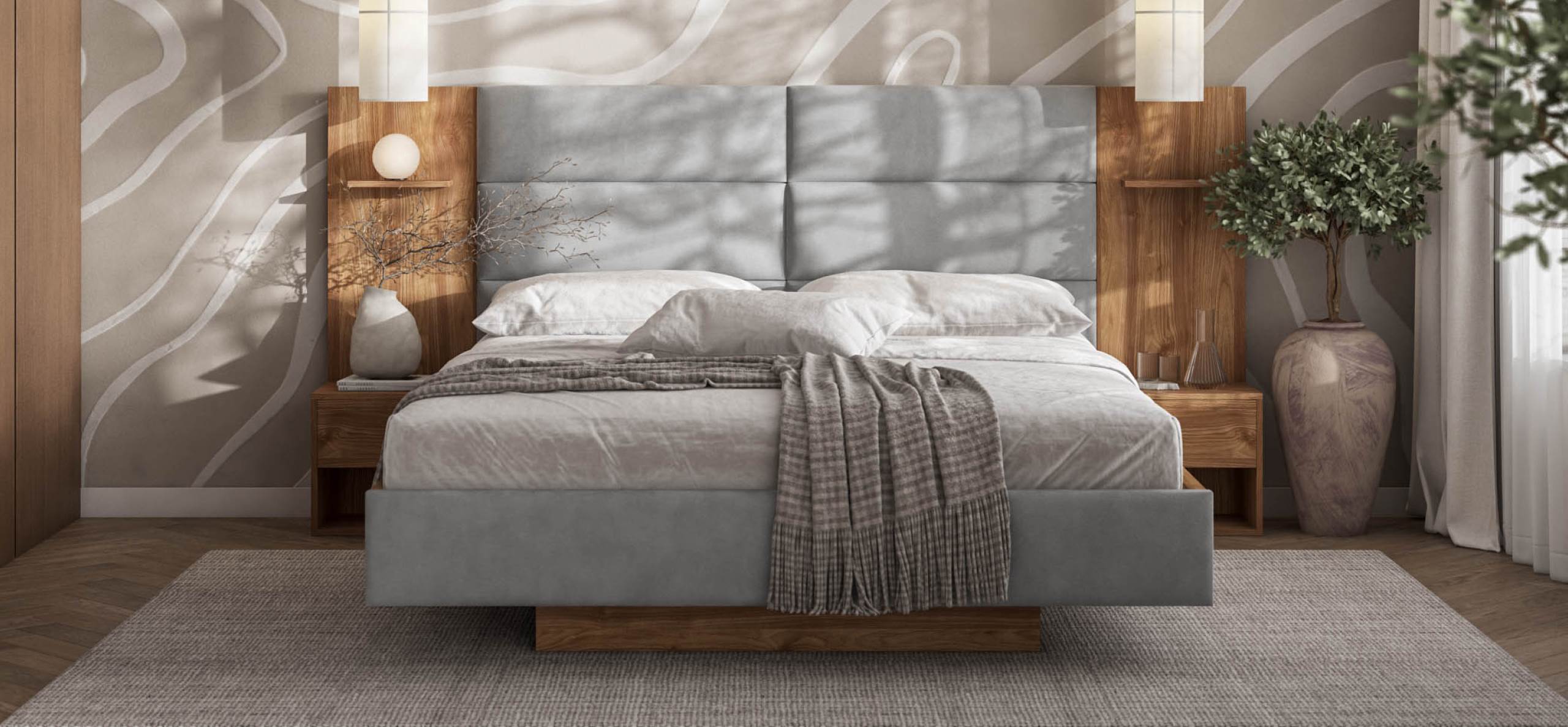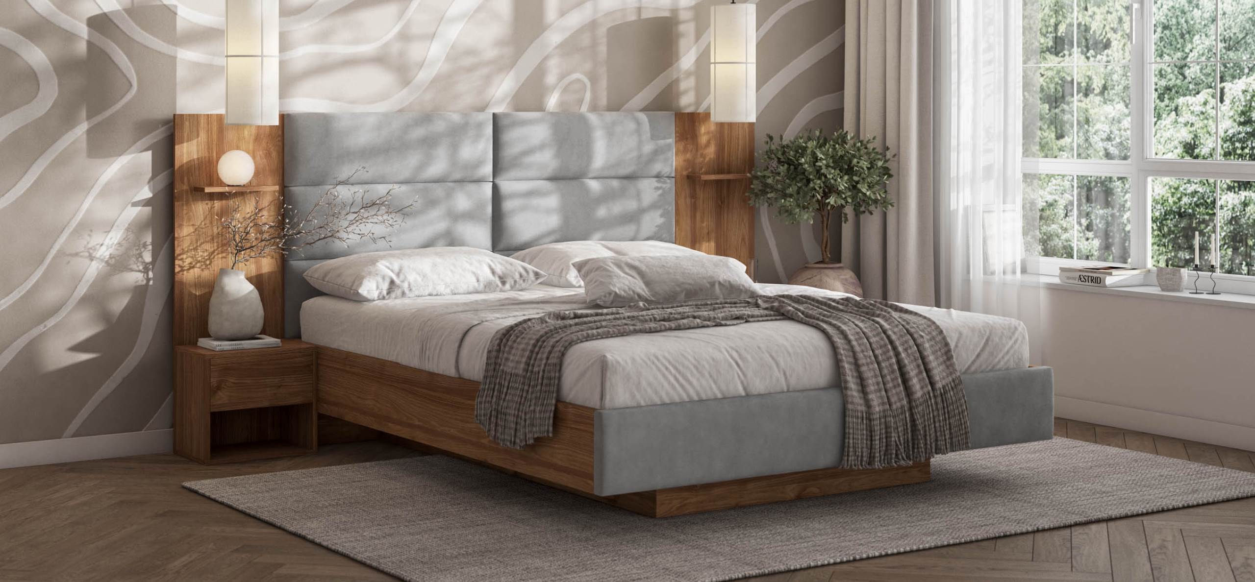 Одной из ключевых особенностей кровати является уникальное сочетание мягкой и корпусной мебели. Мягкое изголовье и передняя царга обеспечивают высокий уровень комфорта и безопасности, тогда как корпусная часть кровати отличается практичностью в использовании и легкостью ухода. Это сочетание древесной плиты и ткани является современным трендом, который продвигает идею экологичности и натуральности в дизайне интерьеров.