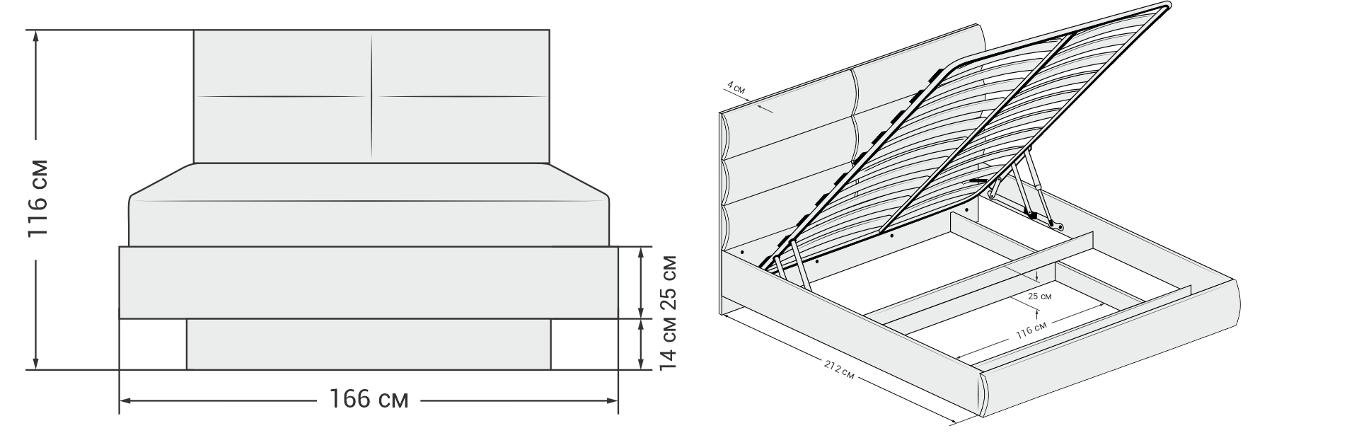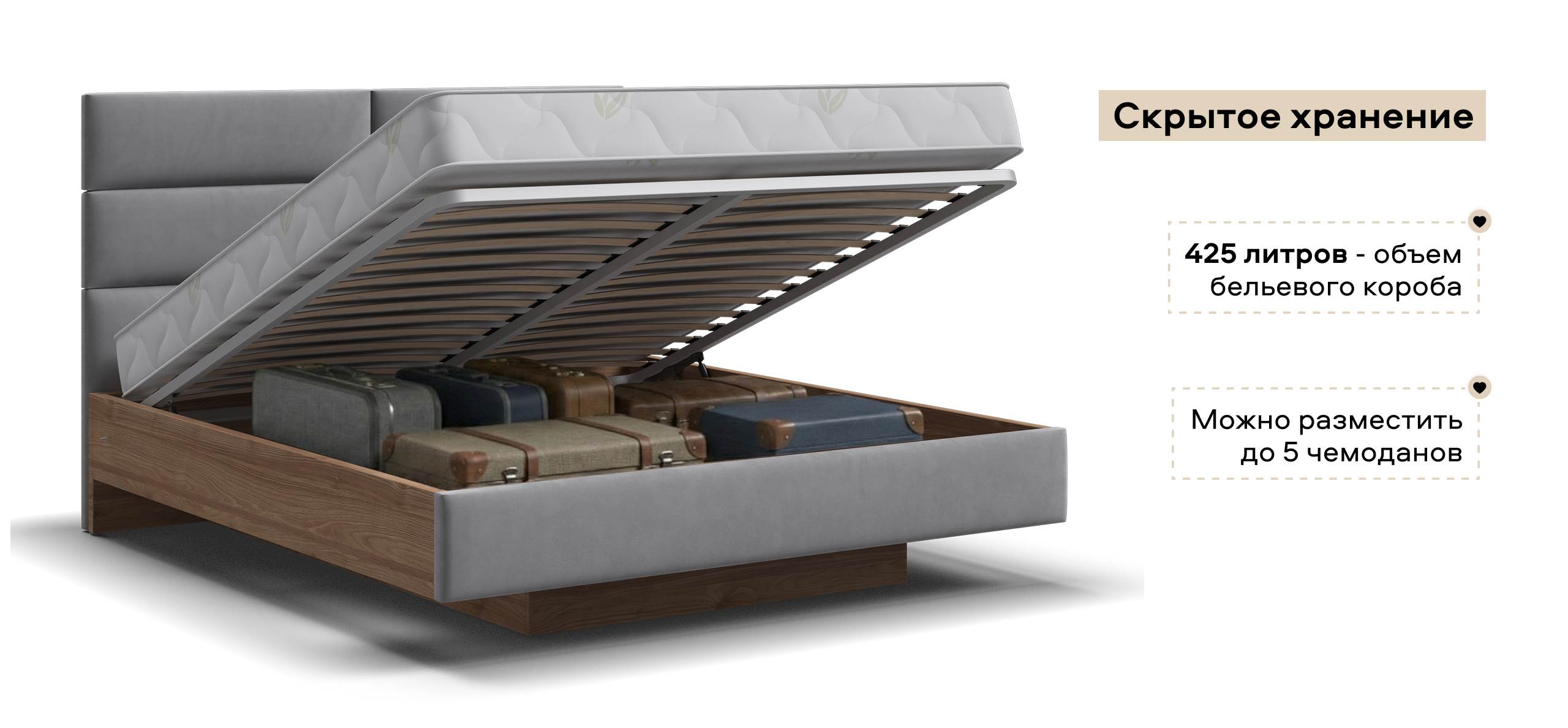 Кровать Босс Лофт оснащена усиленным ортопедическим основанием с подъёмным механизмом, что обеспечивает удобный доступ к бельевому коробу объемом 425 литров. Это делает хранение постельного белья и других вещей более удобным и организованным. Газовые лифты, изготовленные из авиационного алюминия, обеспечивают легкость и надежность подъема.