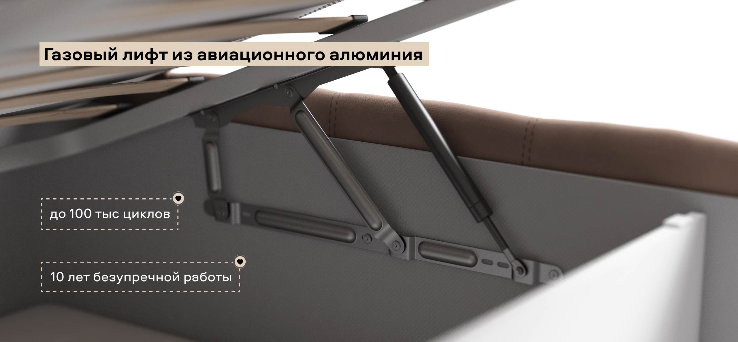 Особое внимание заслуживают газовые лифты SpaceLift, изготовленные из авиационного алюминия. Они обеспечивают лёгкое и плавное поднятие матраса, что делает доступ к отсеку для хранения быстрым и удобным. Дизайн 360 предполагает, что задняя часть спинки кровати также выполнена из основной ткани, что позволяет размещать кровать не только у стены, но и в центре комнаты, сохраняя при этом её эстетическую привлекательность.