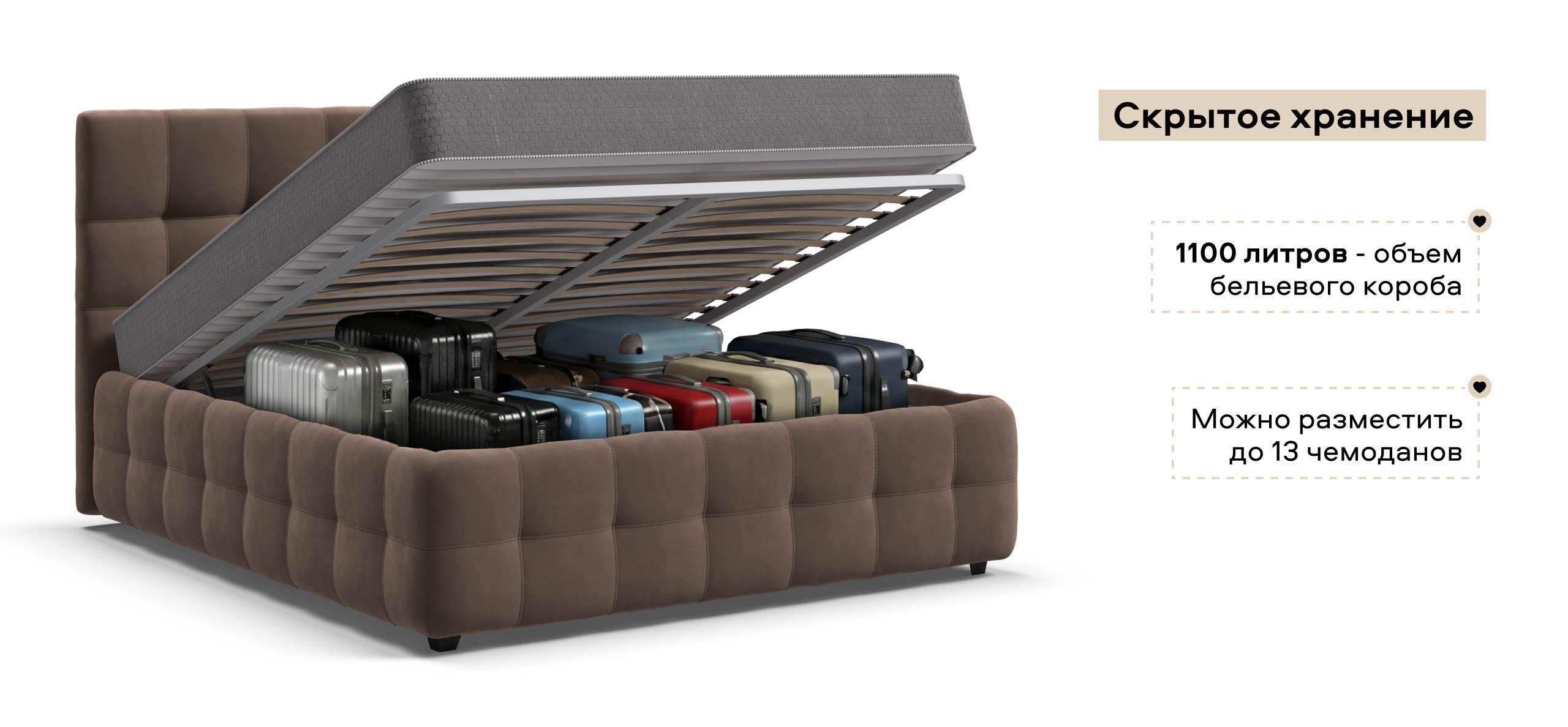 Одним из главных преимуществ кровати Босс является её усиленное ортопедическое основание HEALTHY SLEEP, которое обеспечивает правильную поддержку позвоночника и улучшает качество сна. Благодаря вместительному отсеку для хранения HideBox, объёмом в 1100 литров, у вас будет достаточно пространства для хранения постельного белья и других вещей, что позволяет максимально эффективно использовать пространство спальни.