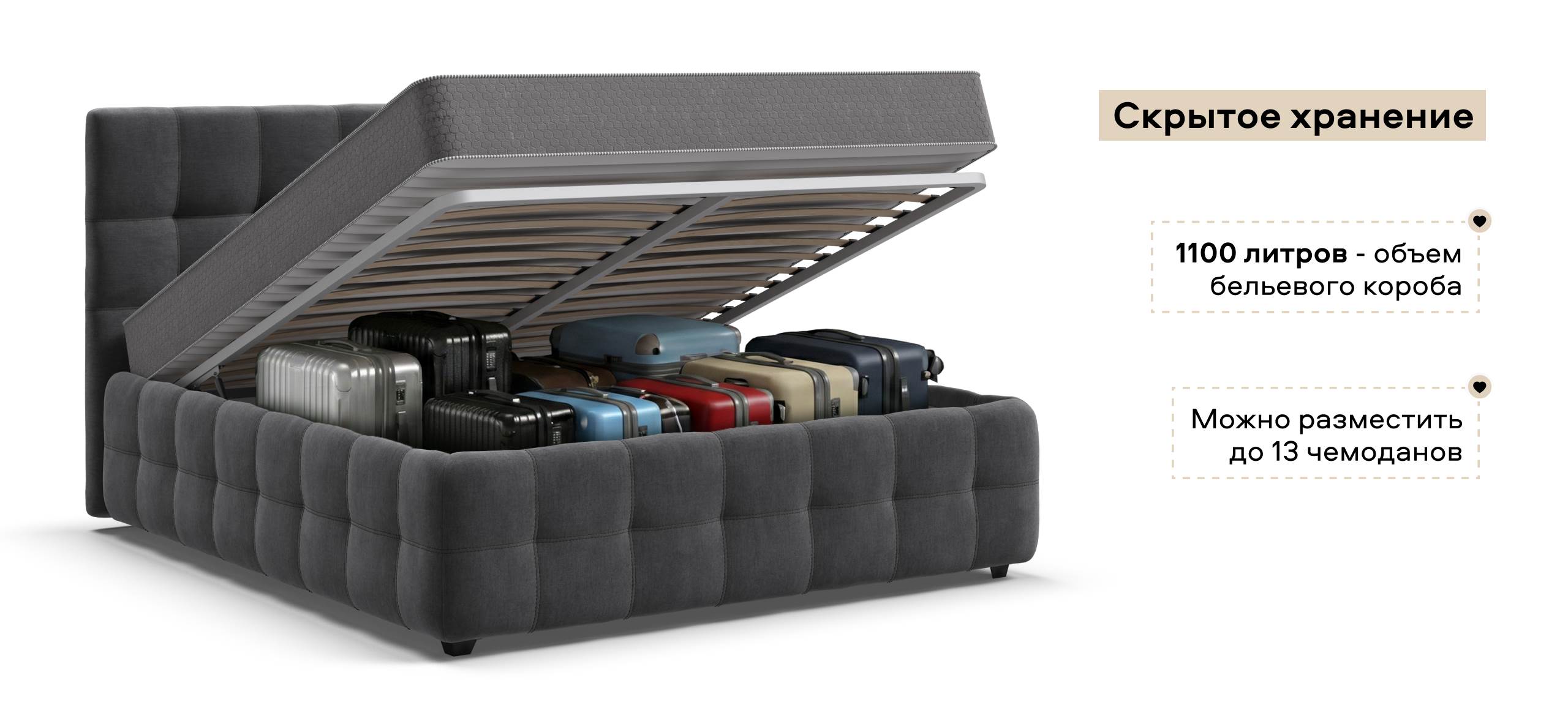 Одним из главных преимуществ кровати Босс является её усиленное ортопедическое основание HEALTHY SLEEP, которое обеспечивает правильную поддержку позвоночника и улучшает качество сна. Благодаря вместительному отсеку для хранения HideBox, объёмом в 1100 литров, у вас будет достаточно пространства для хранения постельного белья и других вещей, что позволяет максимально эффективно использовать пространство спальни.