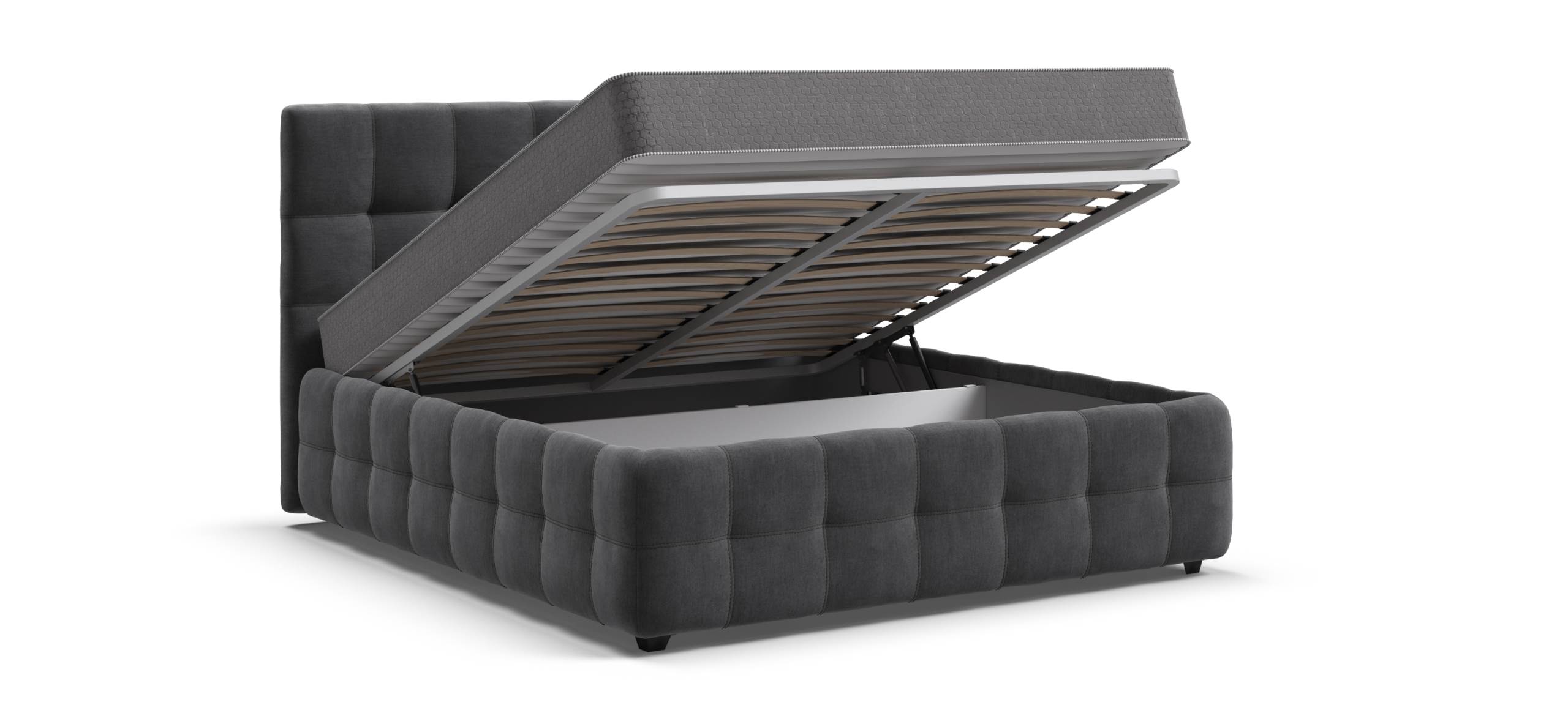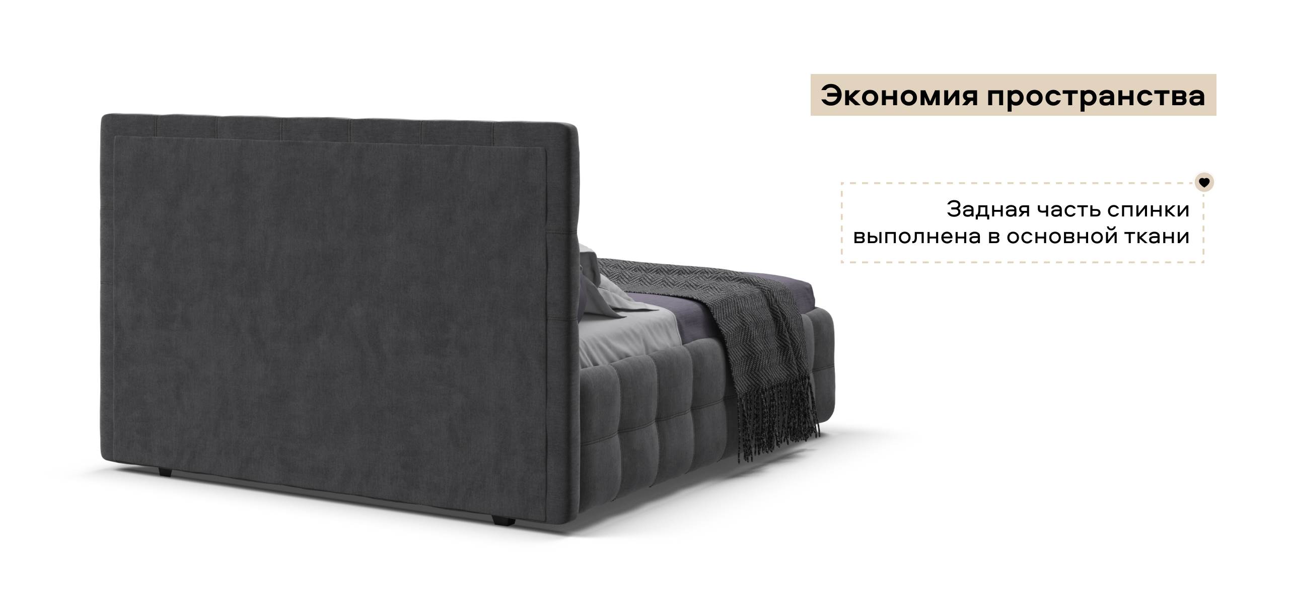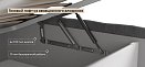 Особое внимание заслуживают газовые лифты SpaceLift, изготовленные из авиационного алюминия. Они обеспечивают лёгкое и плавное поднятие матраса, что делает доступ к отсеку для хранения быстрым и удобным. Дизайн 360 предполагает, что задняя часть спинки кровати также выполнена из основной ткани, что позволяет размещать кровать не только у стены, но и в центре комнаты, сохраняя при этом её эстетическую привлекательность.